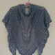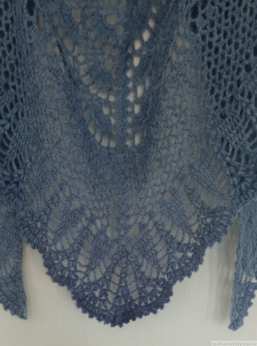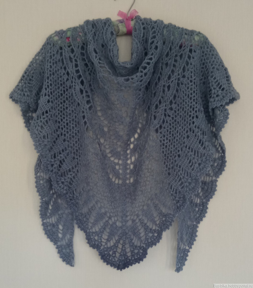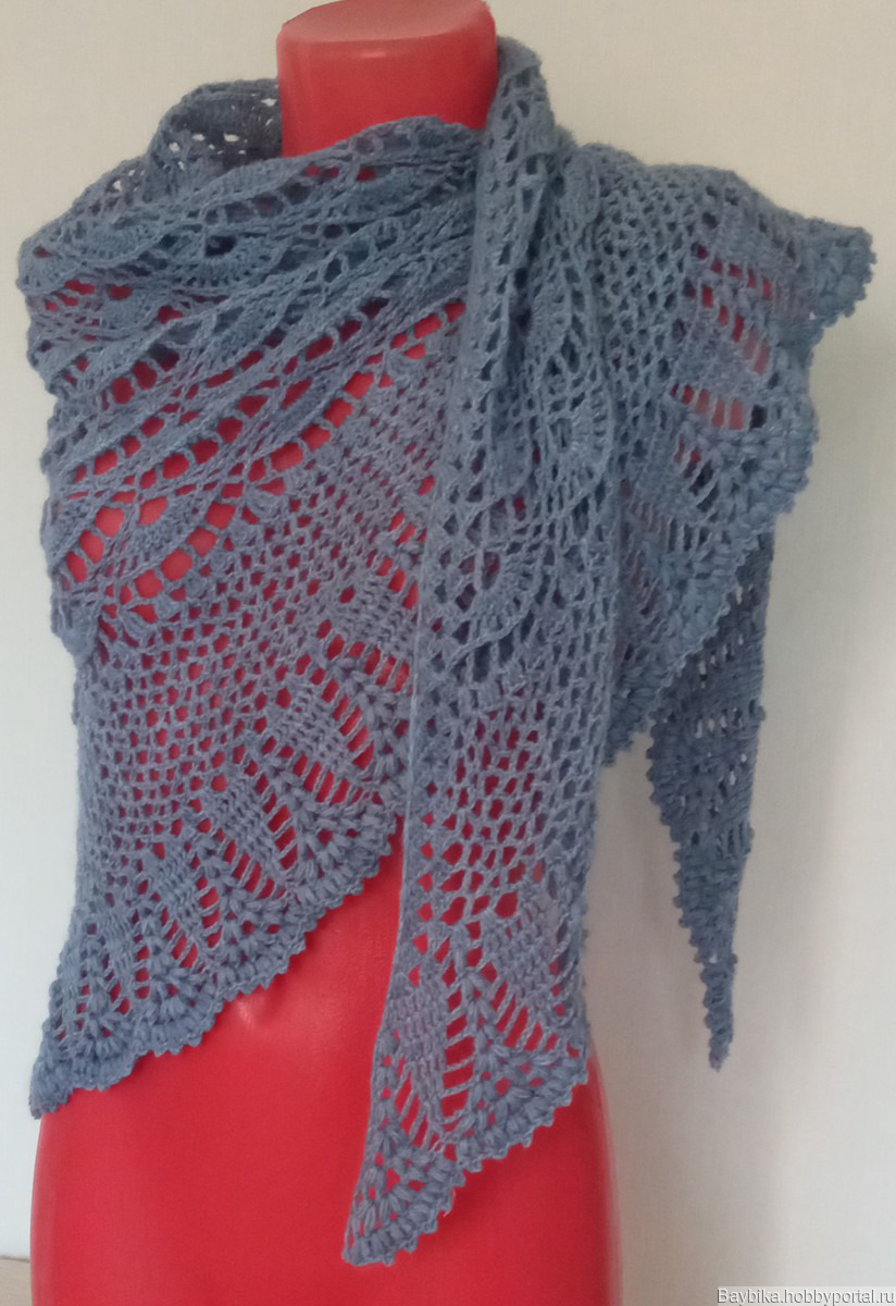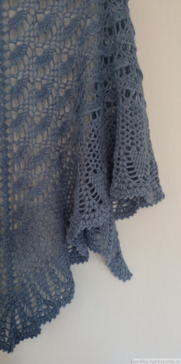 Кружевная вязаная вручную шаль, связана из полушерстяной пряжи в одну нить, цвет называется светлый джинс. Отличный подарок для женщины любого возраста и на любой случай.