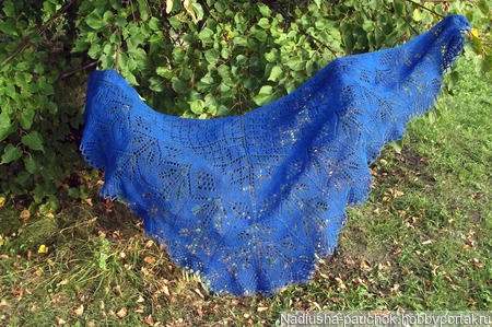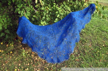 Шаль очень интересная и необычная её серповидная форма очень удобно и красиво ложится по плечам..