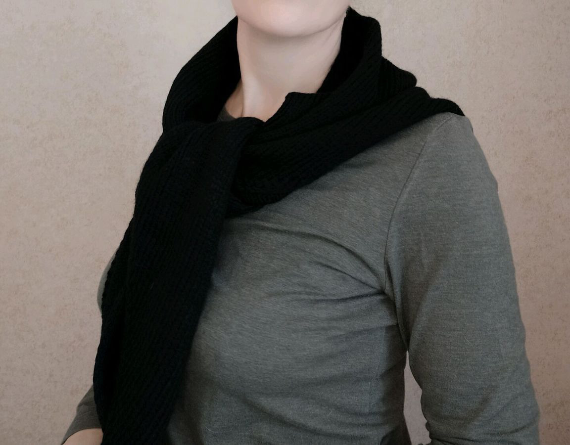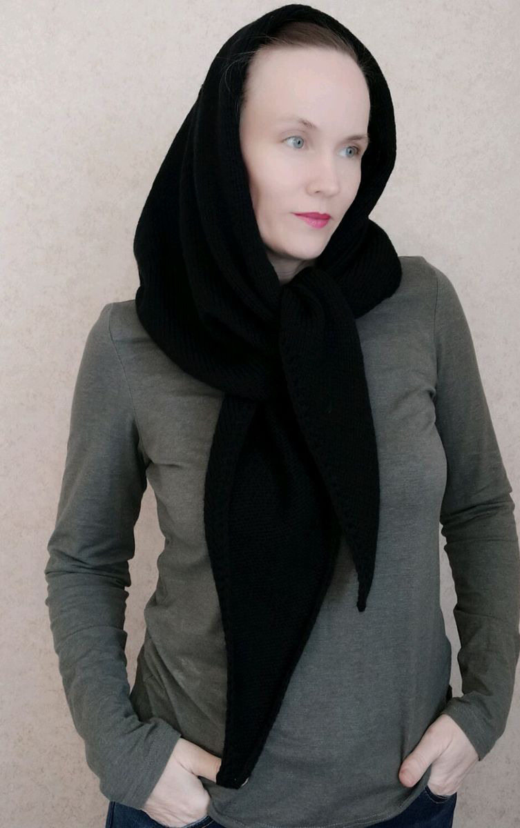 Можно носить углом вперед, как обычный шарф или накинуть на плечи или на голову.
