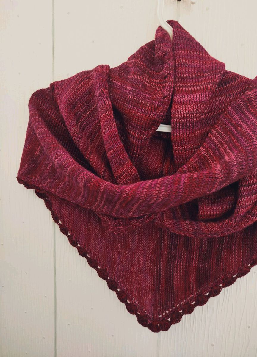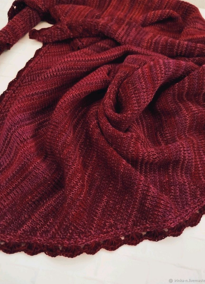Косынка связана сложным меланжем- сочетанием 4х оттенков полушерстяной пряжи - темно красной , бордо , темно розовой и фуксия Все цвета родственные , красиво дополняют и оттеняют друг друга