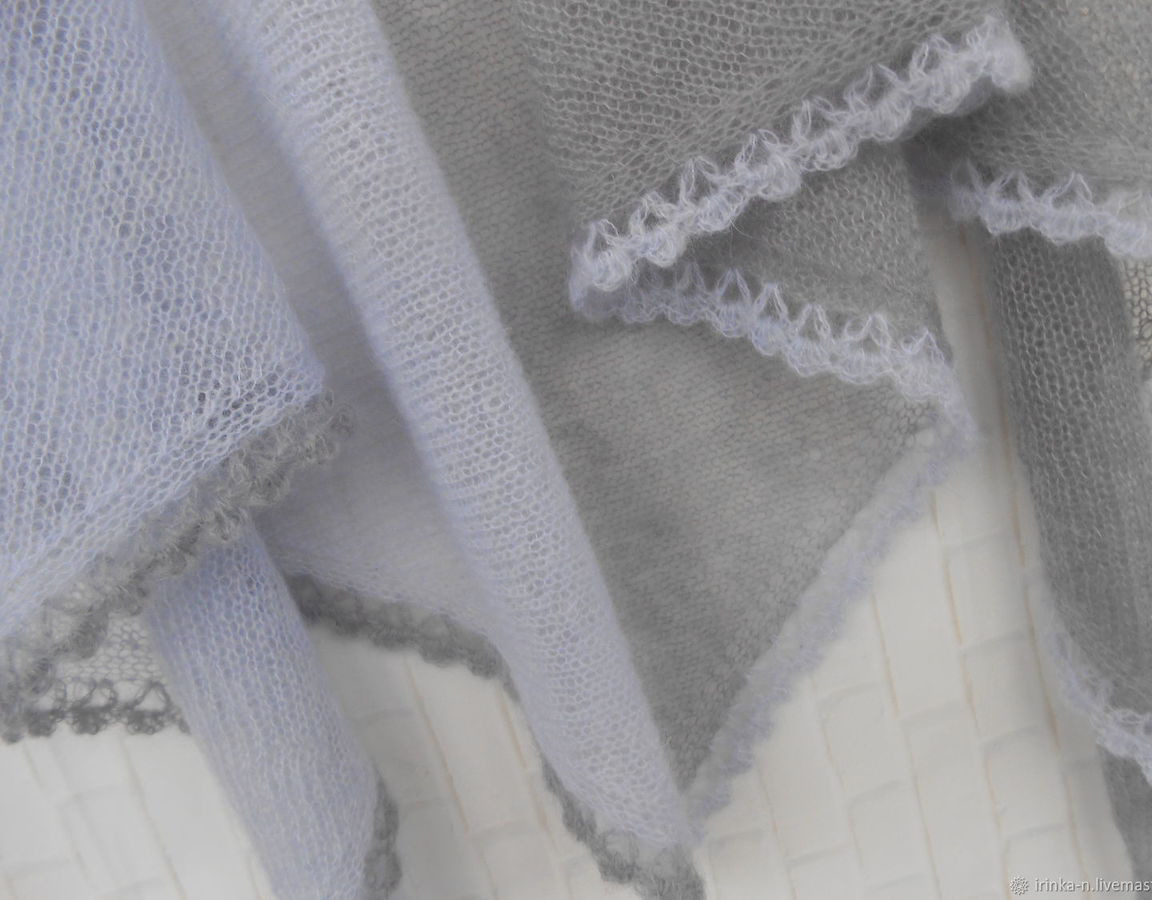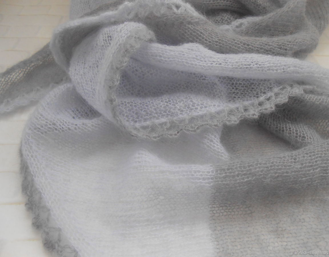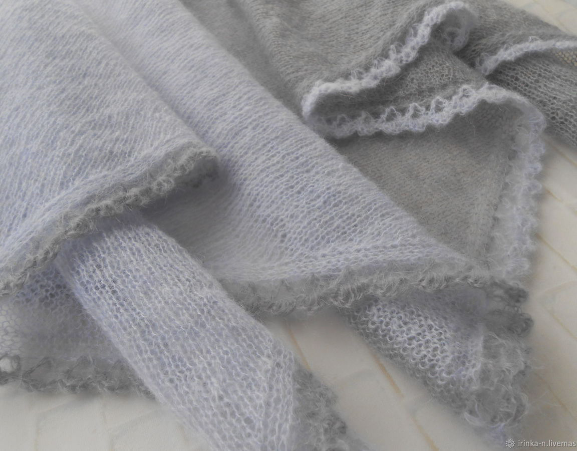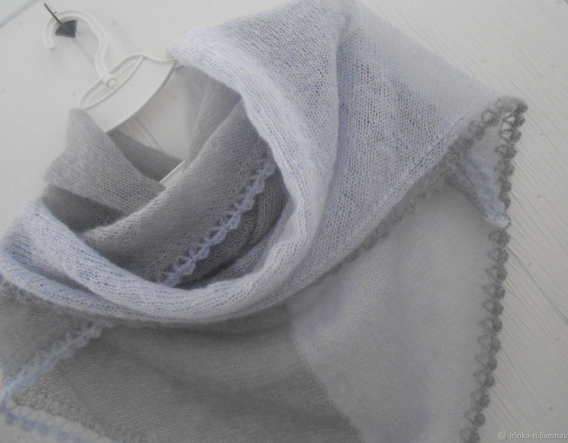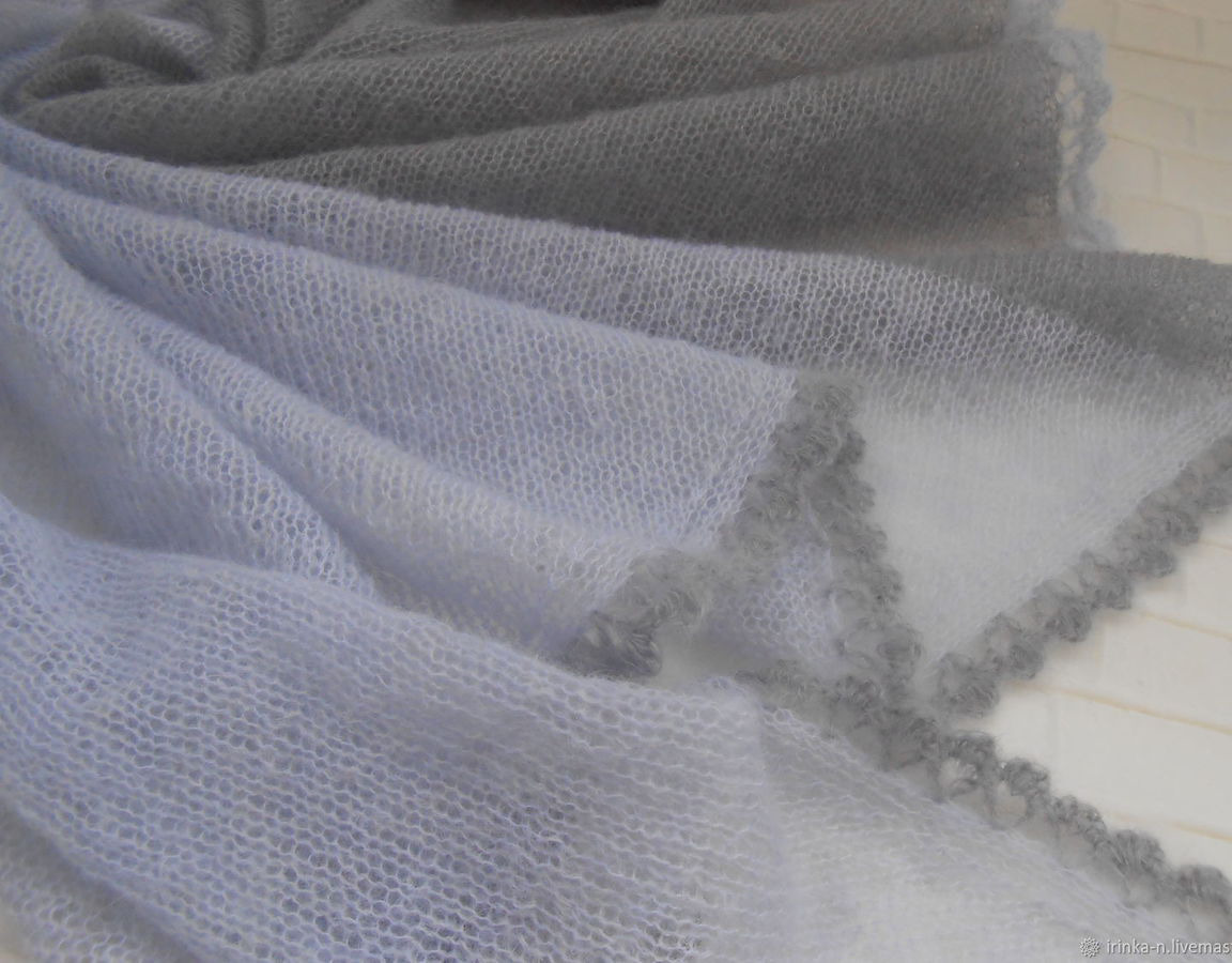 Легкая , почти невесомая косынка " Утро туманное " связана из турецкого кид-мохера двух цветов- светло -серо-голубого и серого с фиолетовым подтоном .