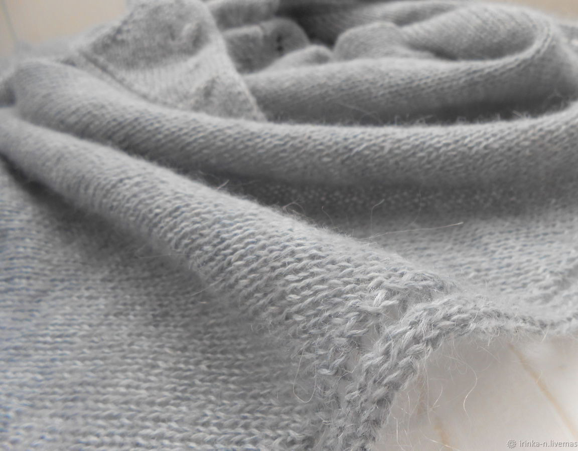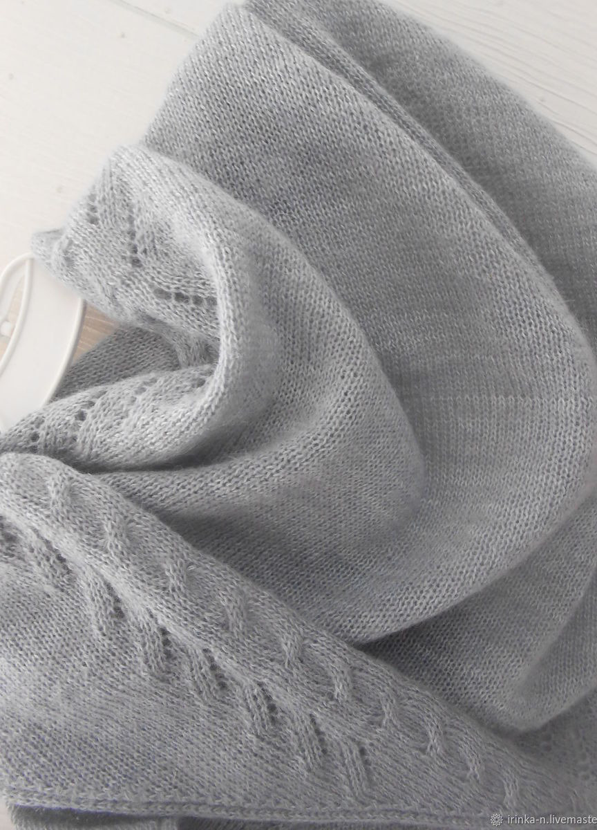 Косынка связана из двух видов пряжи - полушерсти серо-стального цвета и турецкого кид-мохера серо-фиолетового цвета . Обе пряжи хорошо сочетаются и в полотне дают красивый меланж