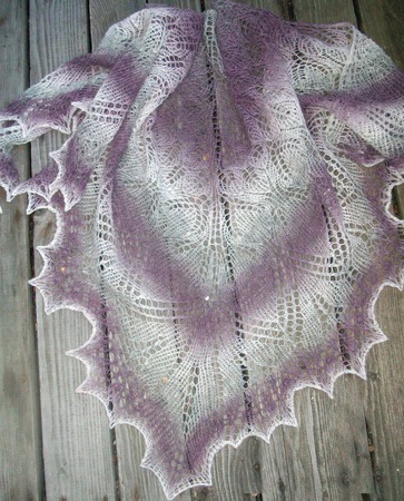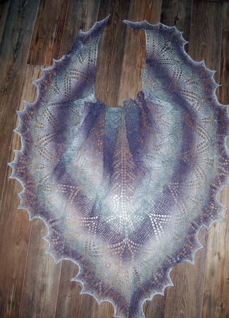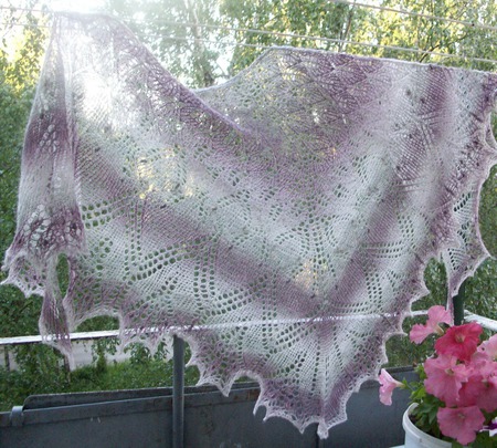 Возможно изготовление этой модели шали в любом другом цвете из натуральной исключительно высококачественной пряжи, преимущественно прибалтийского производства. Готовая шаль бережно выстирана вручную в теплой воде с нейтральными моющими средствами для шерсти; полоскание с кондиционером; отжим в полотенце, блокировка до полного высыхания.