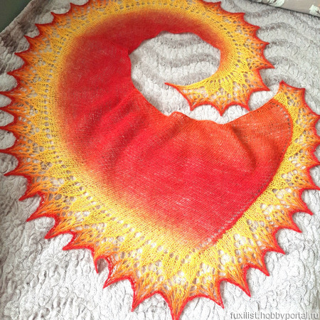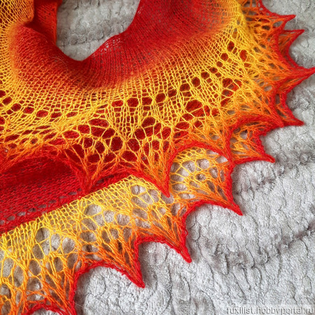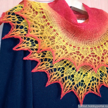 Яркие расцветки с градиентными переходами привлекают внимание и делают эту шаль уникальной, ведь каждый раз оттенки ложатся по-разному.