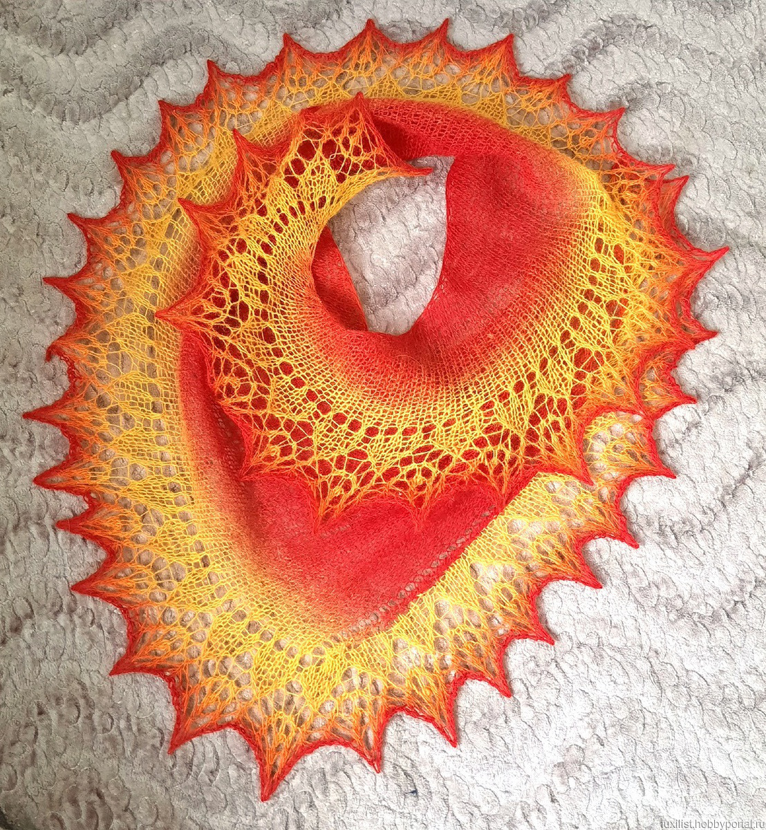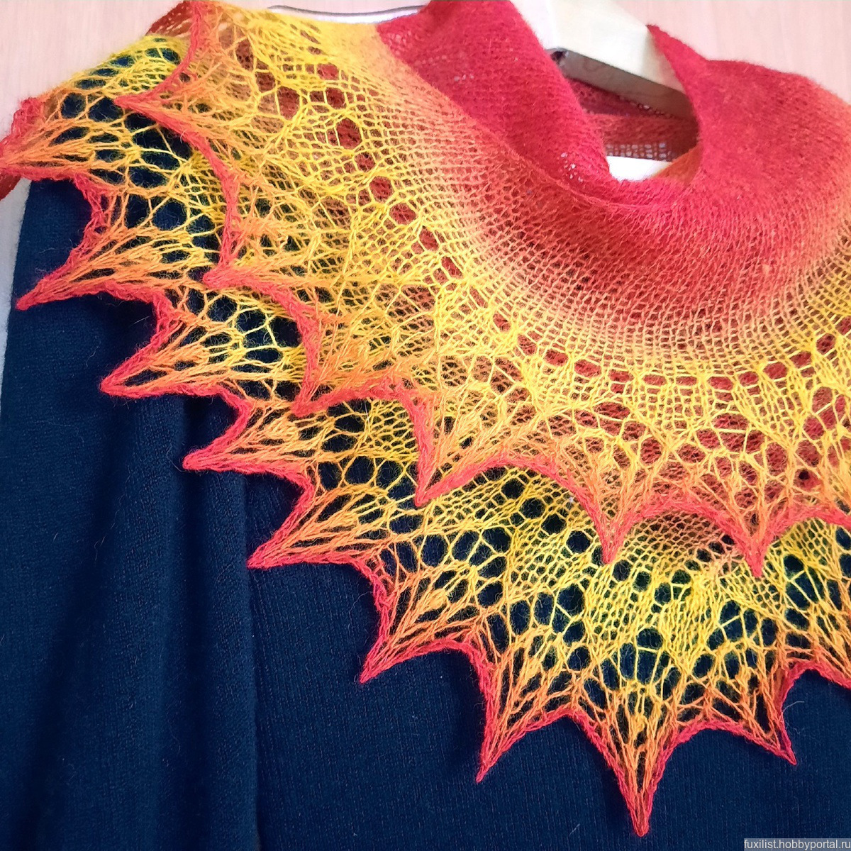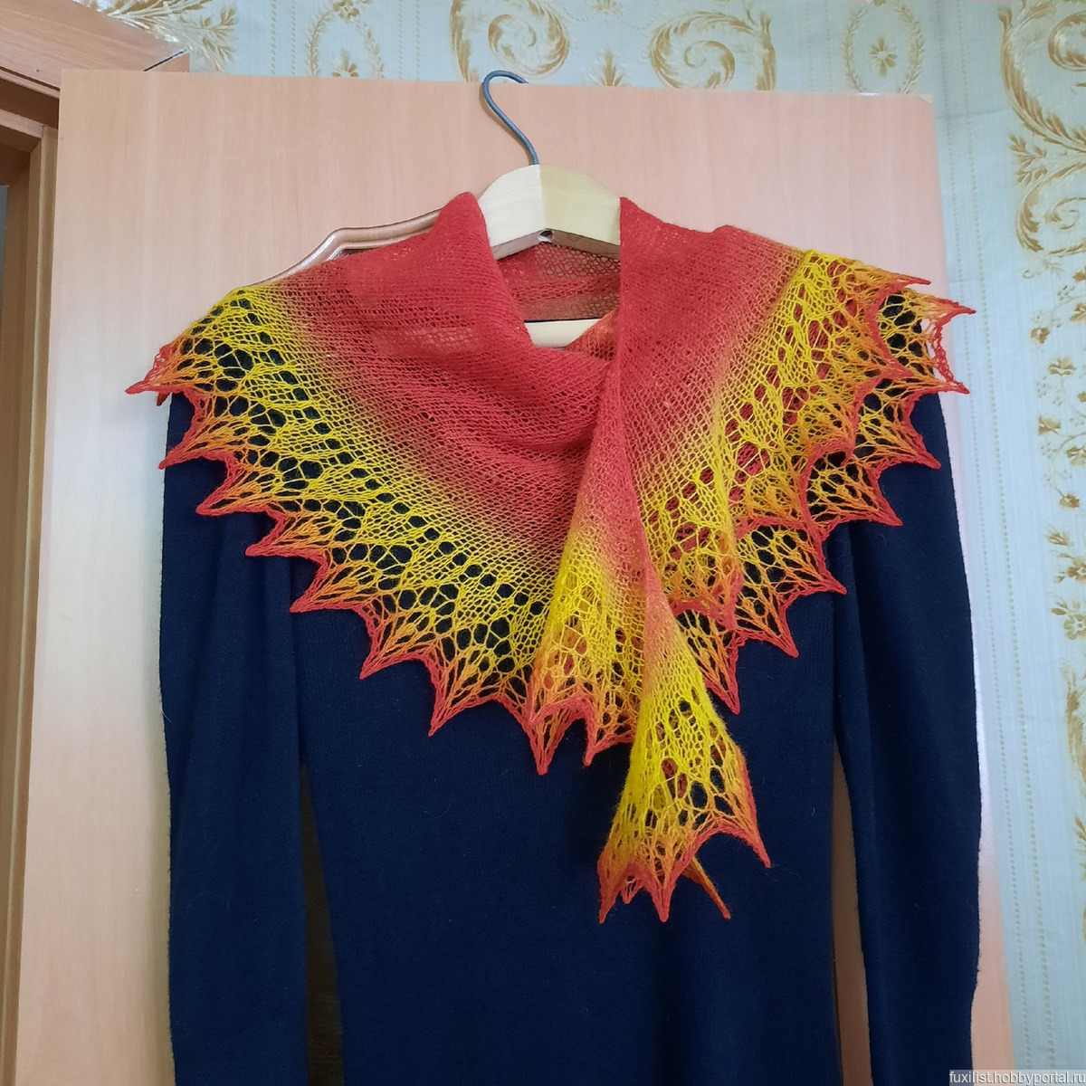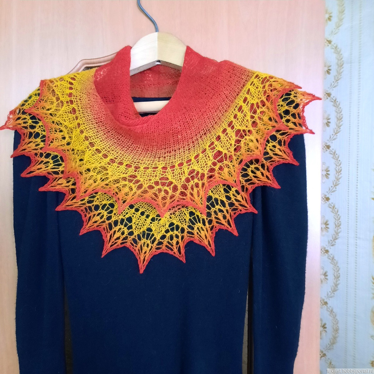 оригинальный подарок, теплый шарф, ажурная шаль, шаль из кауни, шаль из шерсти, фишю, вязаная шаль, шерстяная шаль, минишаль, радужная шаль, недорогие подарки, оранжевая шаль, яркая теплая шаль