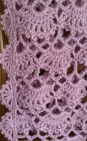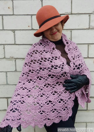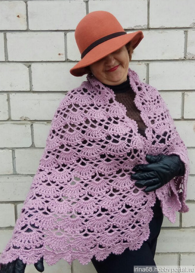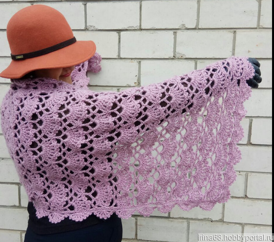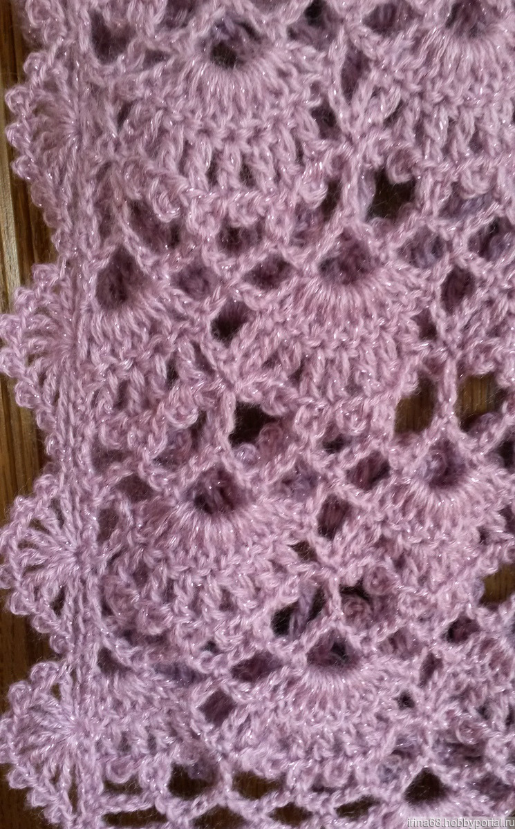 Палантин связан крючком в две нитки. Теплый, приятный, с люрексовой ниточкой тоненькой, красивый. Набросить на работе, в межсезонье, когда нет отопления - одна красота. Длина - 1,30 см, ширина - 70 см.