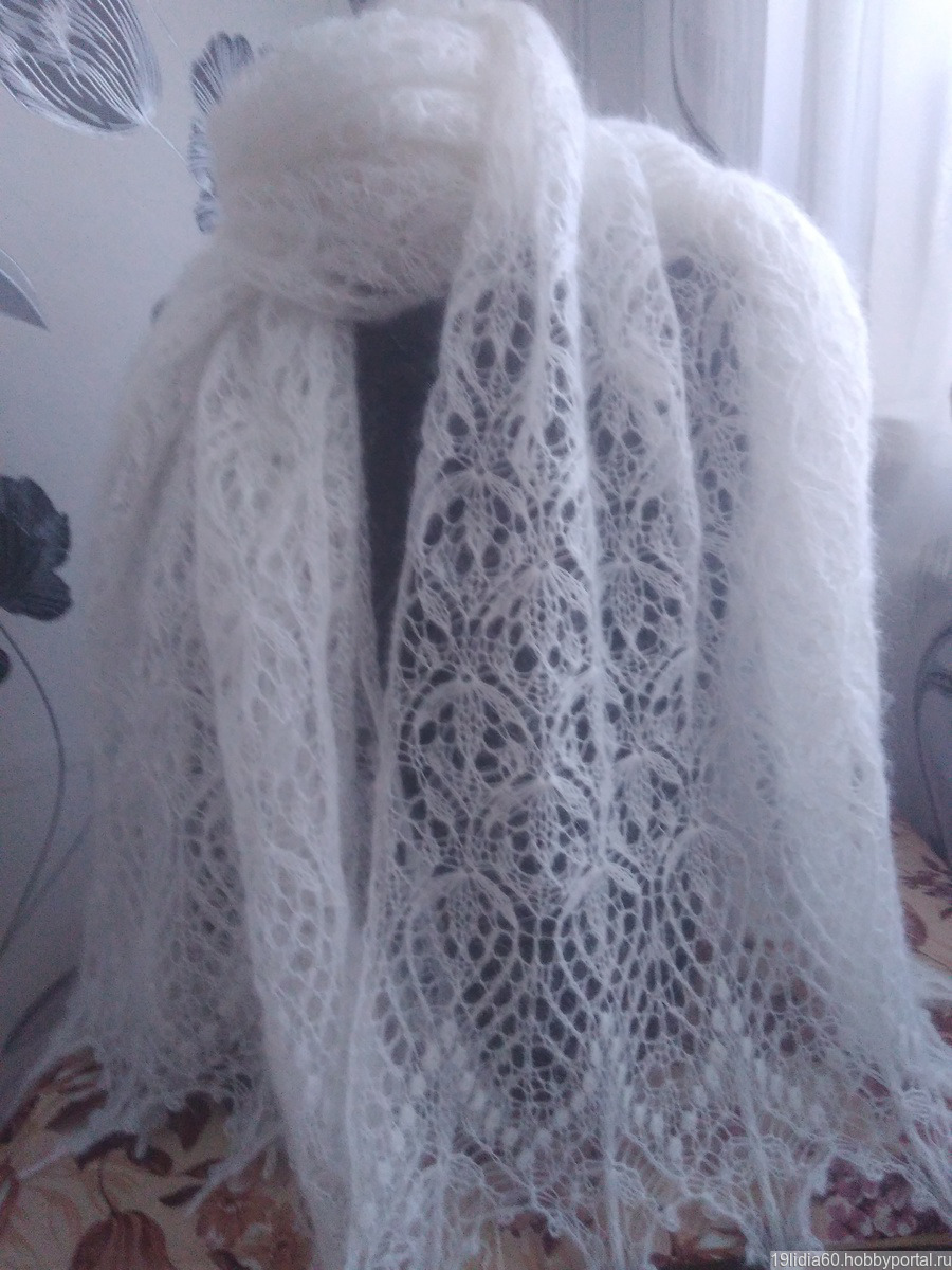 Палантин связан из кидмохера в две нити. Легкий, ажурный и одновременно теплый. Дополнит женский наряд, согреет в прохладную погоду. Послужит в качестве подарка. Продается в красивой подарочной упаковке. Размер 180*85.