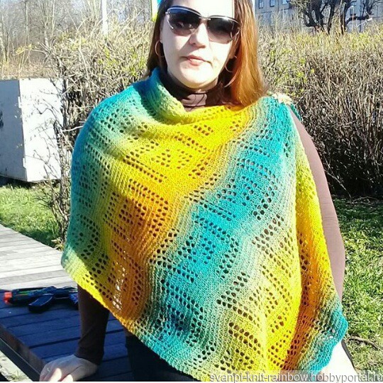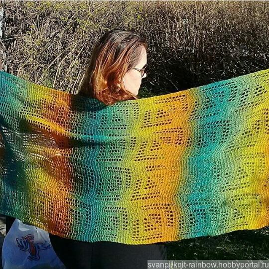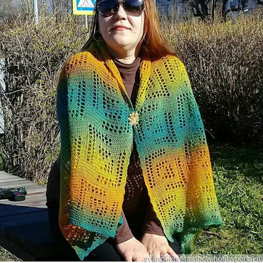 Очень тёплый, хотя ажурный и лёгкий. Яркий. Уютный. В него можно укутаться, а можно закрепив брошью, превратить в симпатичную накидку.