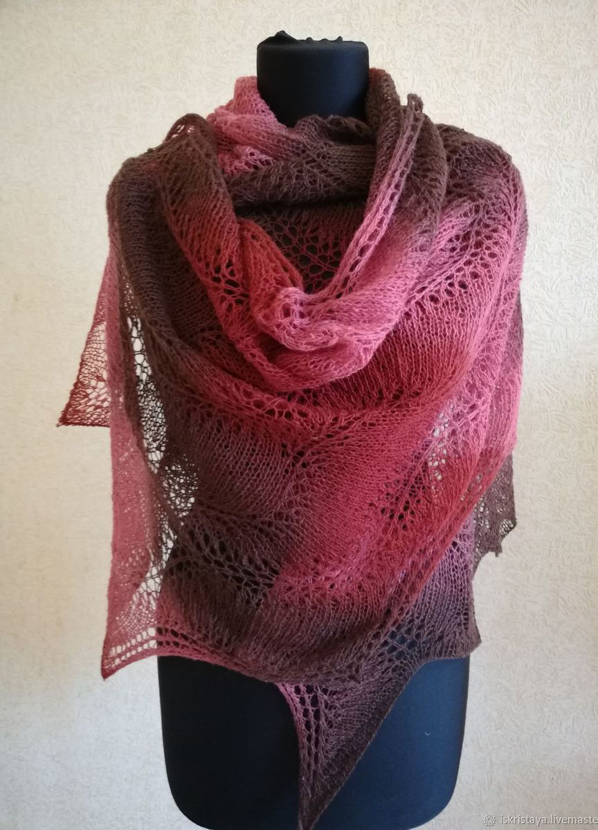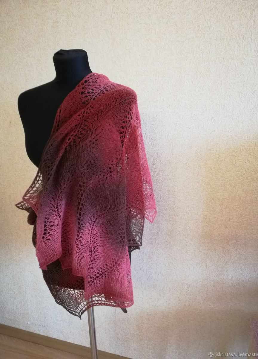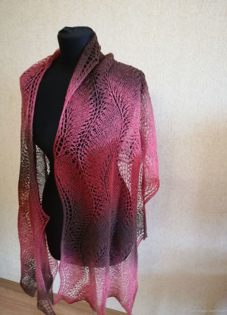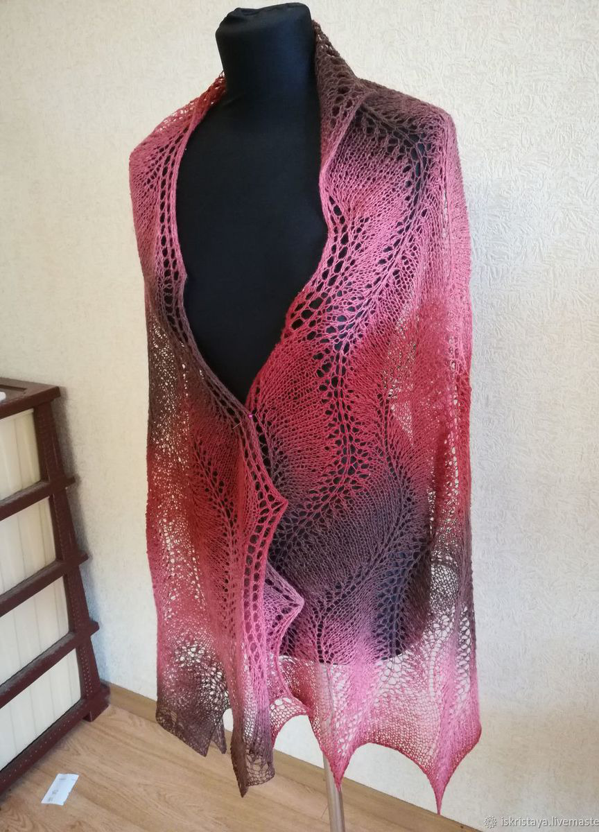 Палантин Розовый дракон выполнен спицами из эстонской шерстяной пряжи Кауни. Очень красивые плавные переходы цвета. Палантин можно носить с верхней одеждой, а можно просто накинуть на плечи в офисе или дома. Размер 190 /50