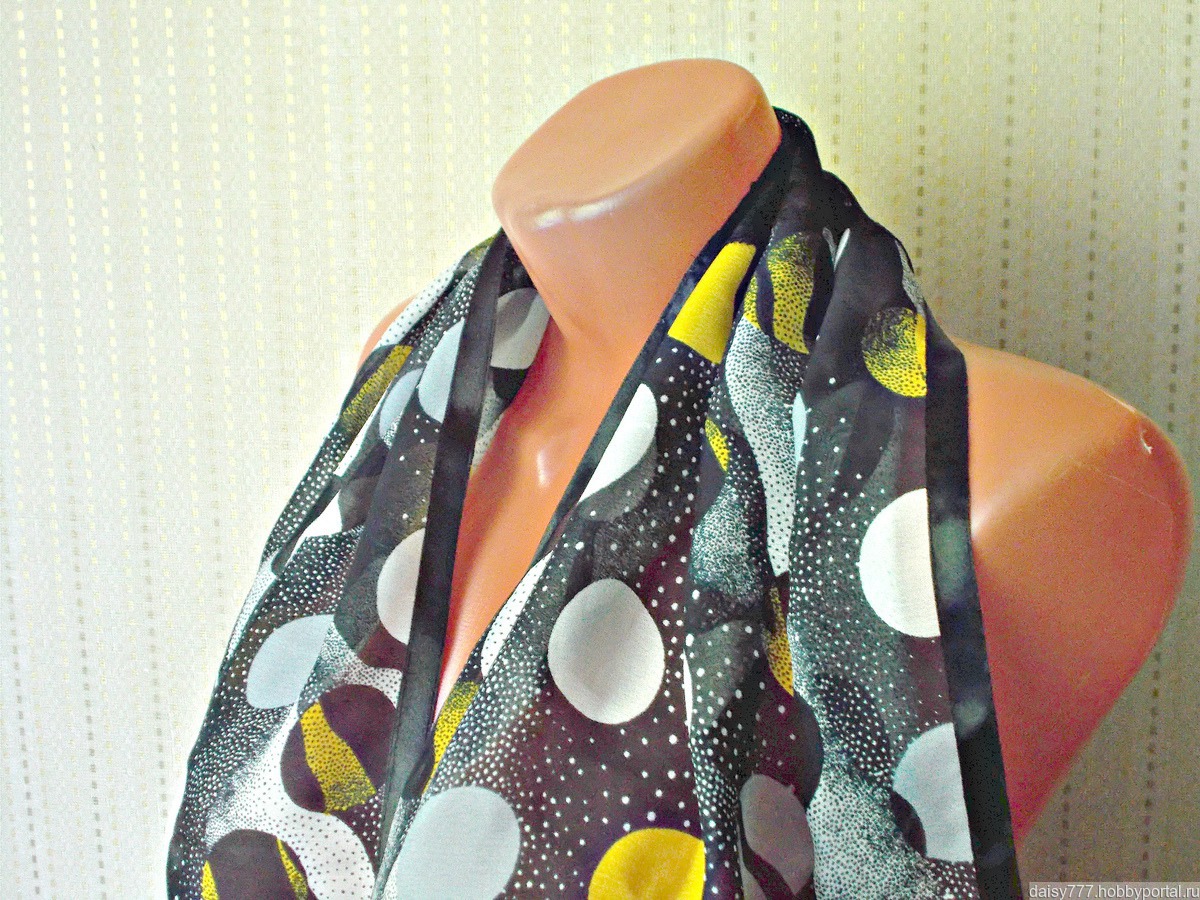 Палантин «Полнолуние» модель 1 сшит из тонкой, мягкой, гладкой, прозрачной ткани (шифон, состав — 100% хлопок). Рисунок ткани напоминает небо в полнолуние: круглая луна, звезды, облака, периодически закрывающие луну. Основные цвета — черный, молочно-белый, серебристо-серый, желтый.