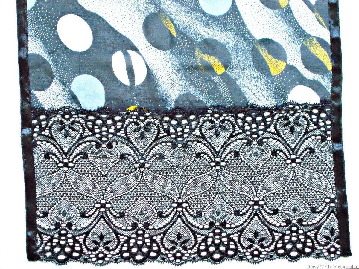 Главное украшение палантина «Полнолуние» - широкое эластичное черное кружево шириной 18 см с рисунком в виде сердечек. Оно пришито к коротким сторонам палантина. Из этого же кружева сделана центральная вставка.