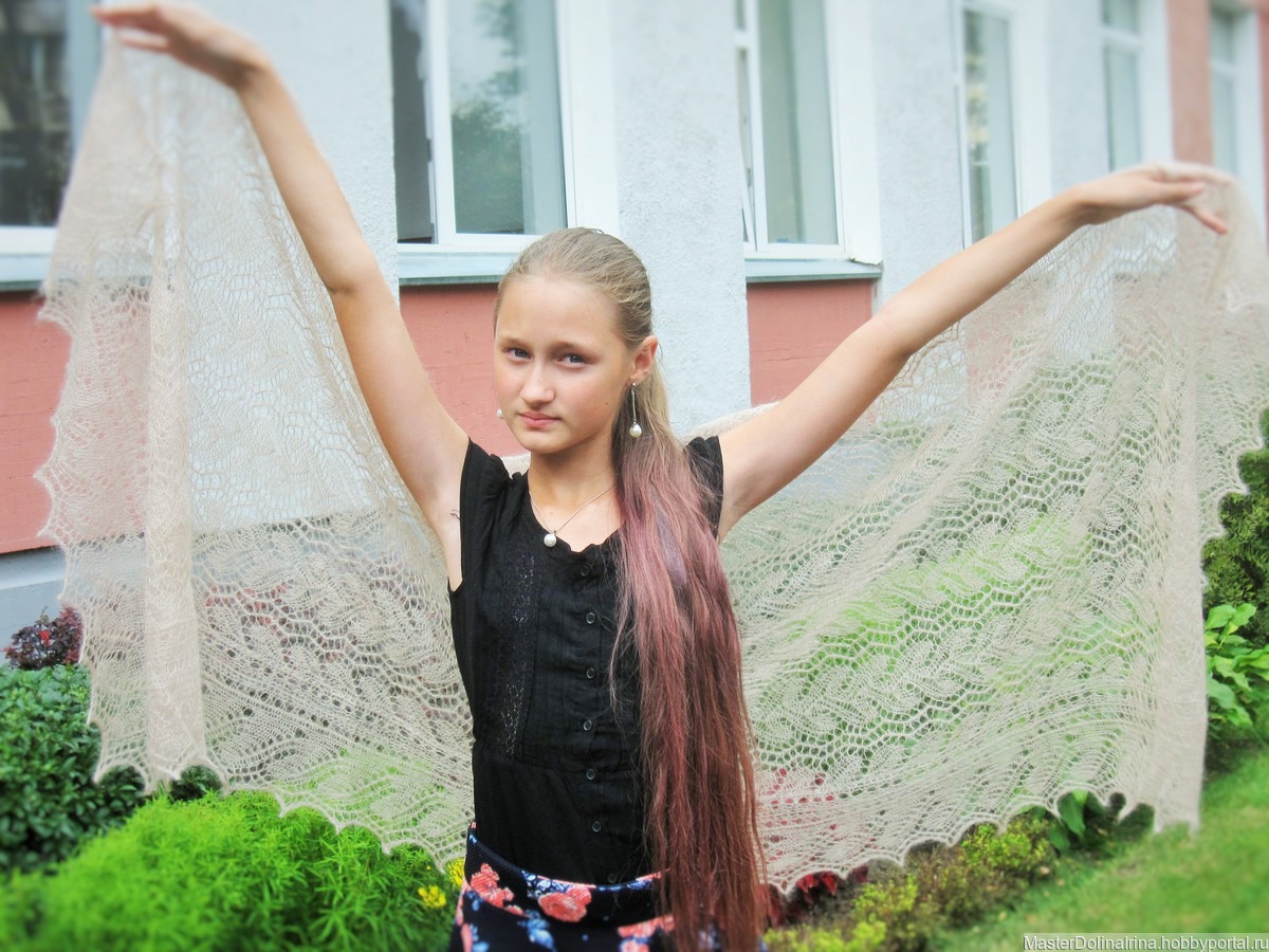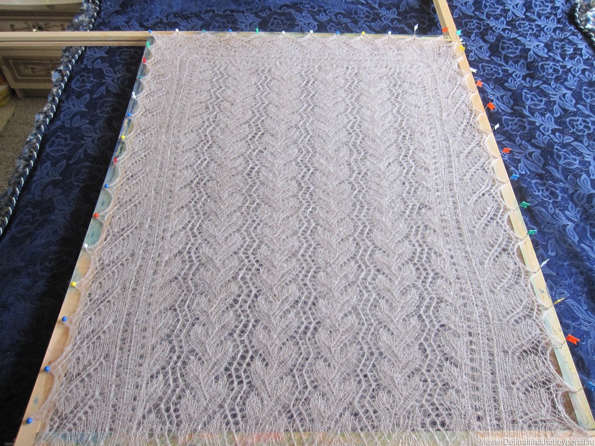 Бережное обращение, стирайте в прохладной воде с жидкими средствами для шерсти и шелка. Руками не тереть, замочить на 15 минут, прополоскать и разложить на горизонтальной поверхности, сделав блокировку шали и помощью портновских иголочек.