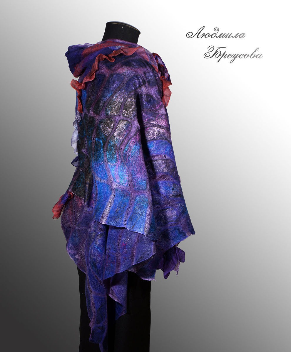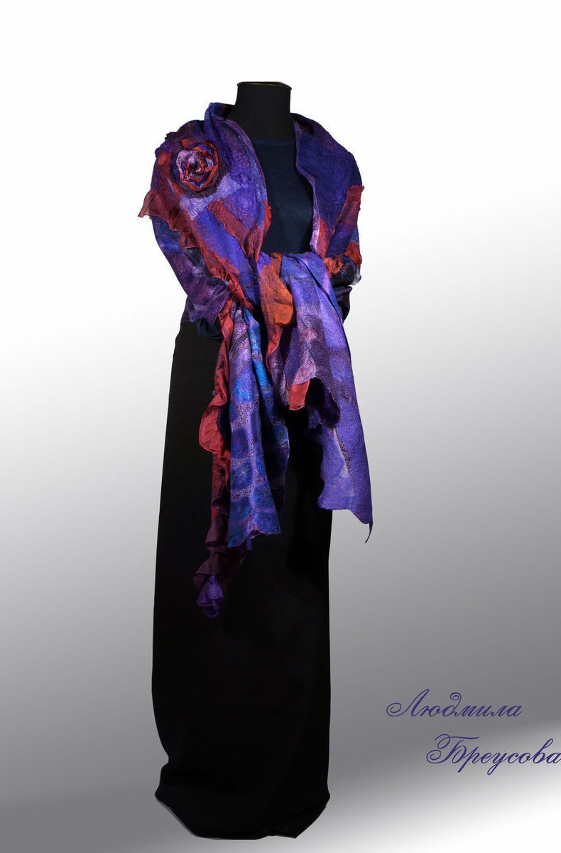 Валяный палантин выполнен в технике нуновойлока, т.е сваливания шерсти и шелковых тканей.