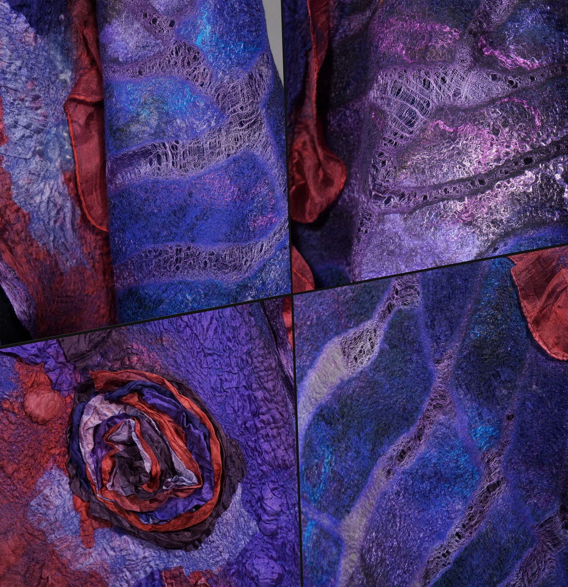 Пунш сложный и пьянящий напиток из вина, рома, фруктов и специй. Так и этот богатый палантин сочетает разные шелка, сложные фактуры и объемные элементы.