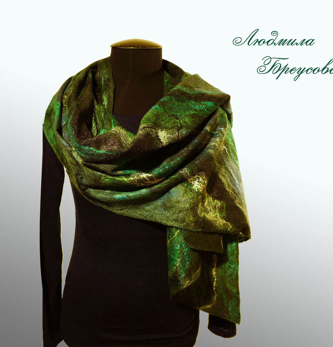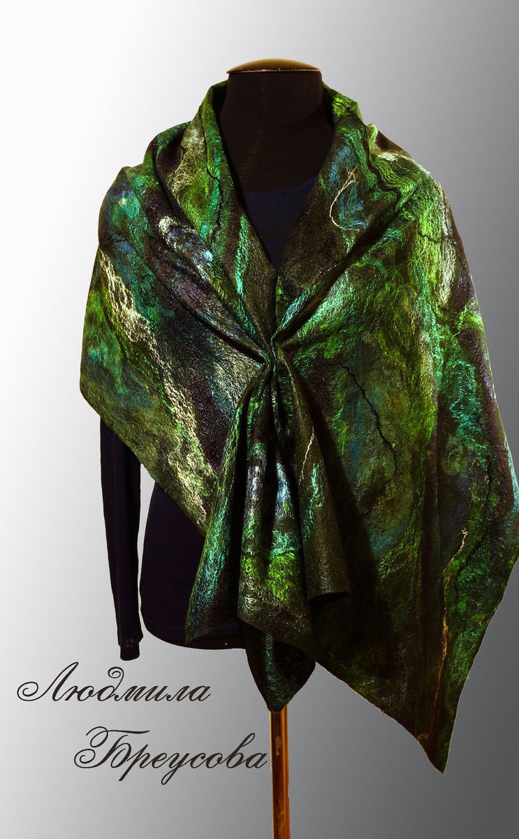 Это палантин Малахит из серии Камни и минералы. Создан вручную методом валяния. Только натуральные материалы: шерсть и натуральный шёлк в качестве декора. Именно шелковыми волокнами я создавала рисунок, имитирующий прожилки на минерале.