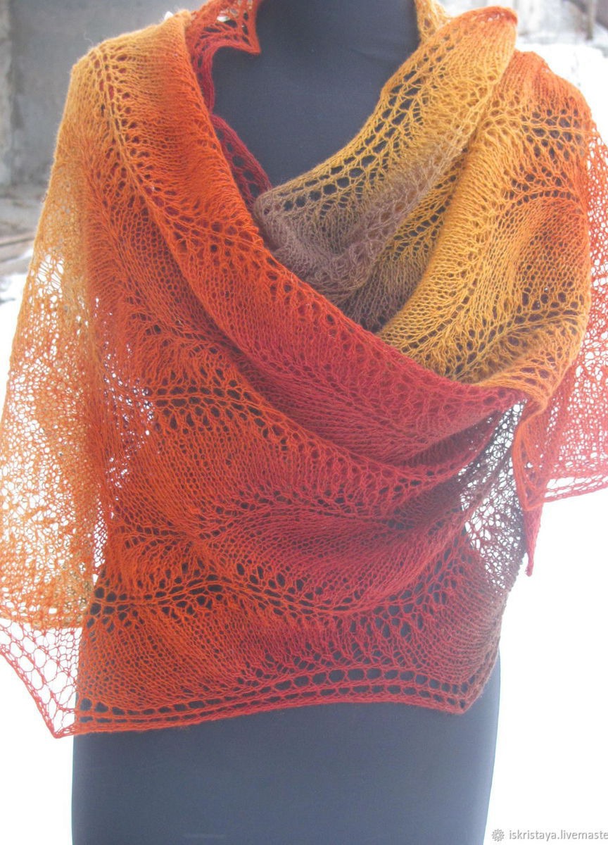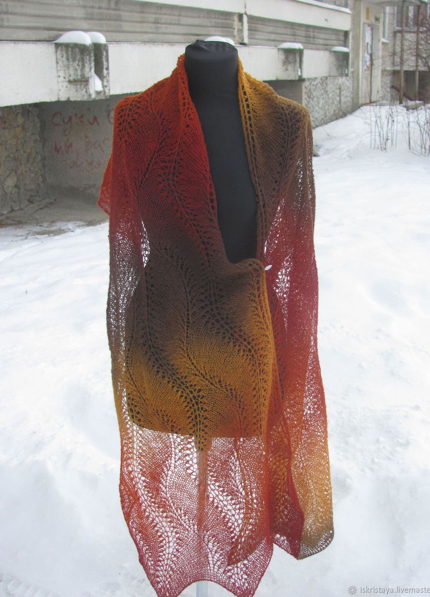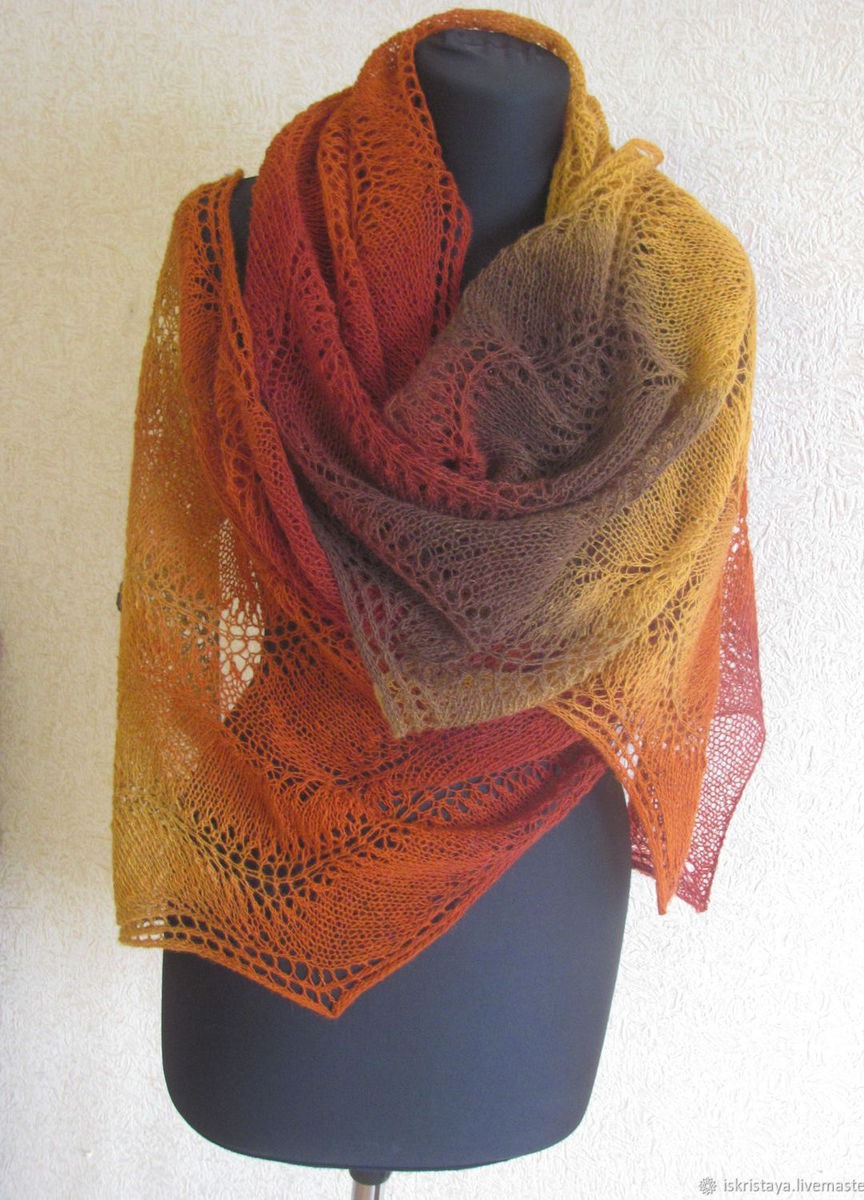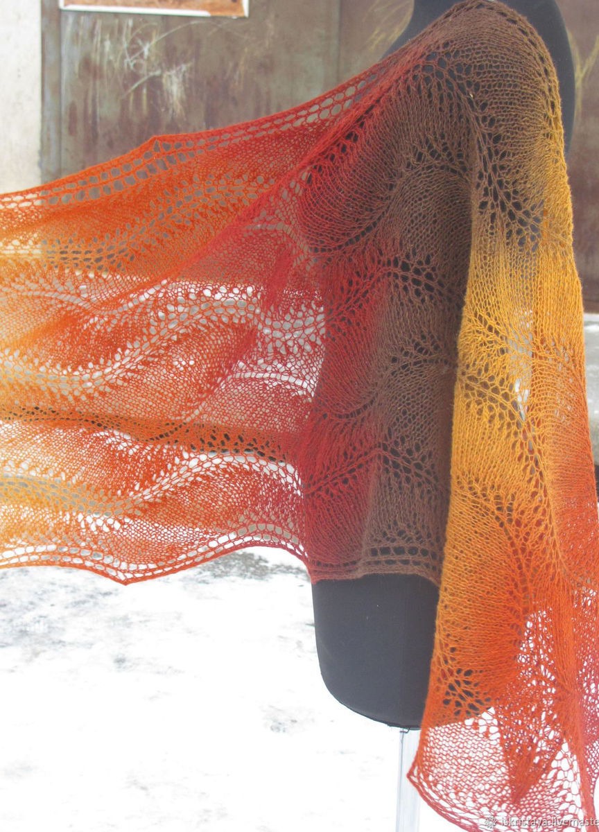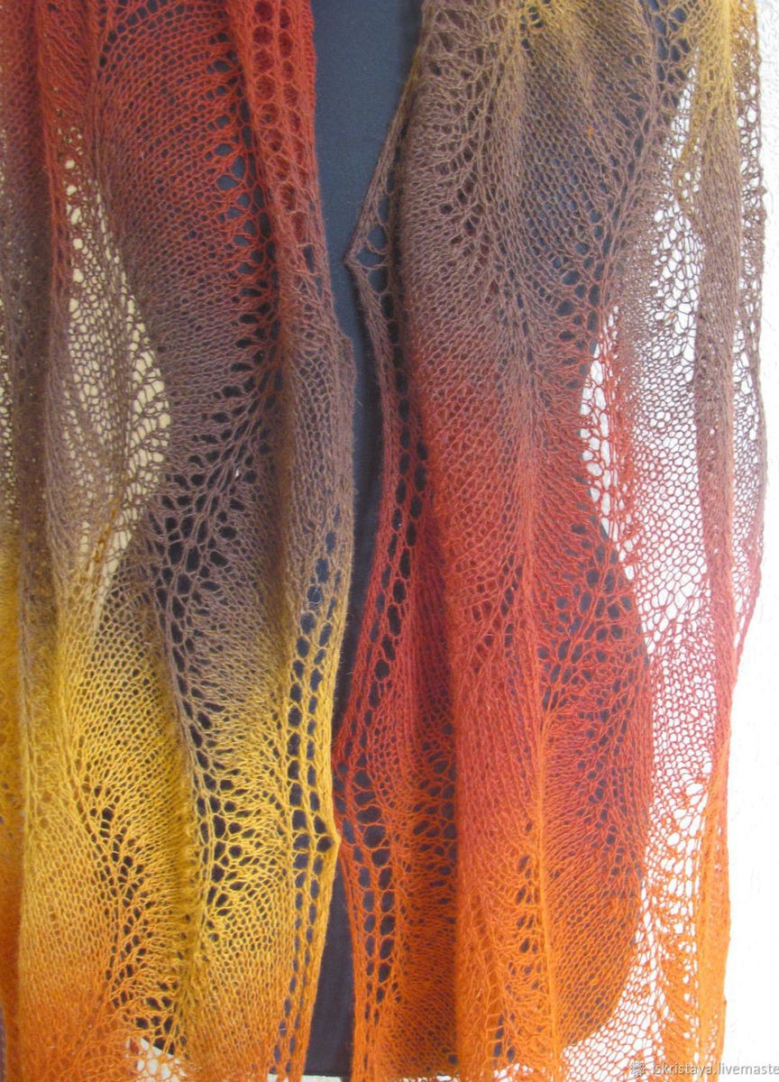 Красивейший палантин в осенних тонах выполнен из эстонской пряжи Кауни( 100 % шерсть). Ажурный узор, плавные переходы цвета подчеркнут Вашу индивидуальность. Благодаря длине 220 см палантин прекрасно драпируется. Можно носить поверх пальто или шубки или просто накинуть на плечи в офисе. Возможно выполнение в другом цвете и меньшей длины