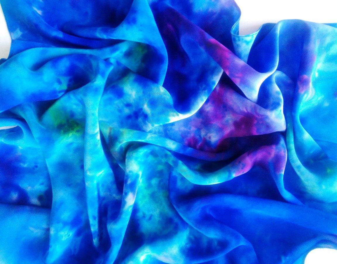 ЯРКИЙ ШЁЛКОВЫЙ шейный платок из натурального КРЕПДЕШИНА средней плотности, окрашен вручную в смешанной технике.