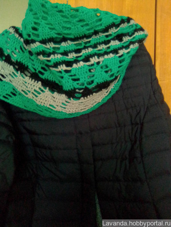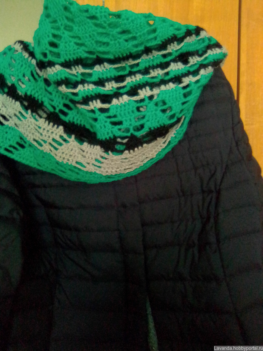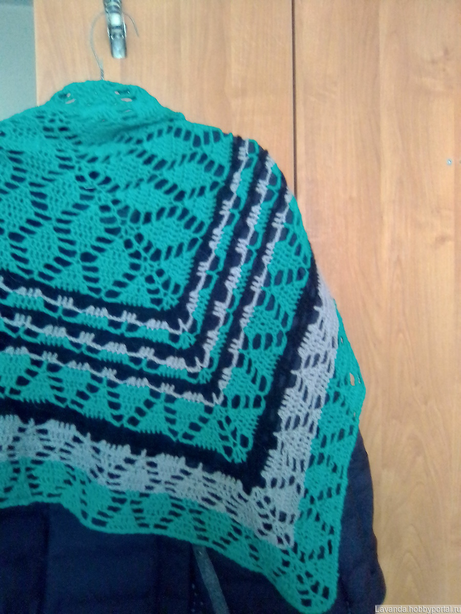 Связана из немецкой шерстяной пряжи с альпакой.Легко драпируется, мягкая, приятная на ощупь. После длительной носки не образовывает катышков. Проверено на себе ( ношу из этой пряжи шапку и платок)