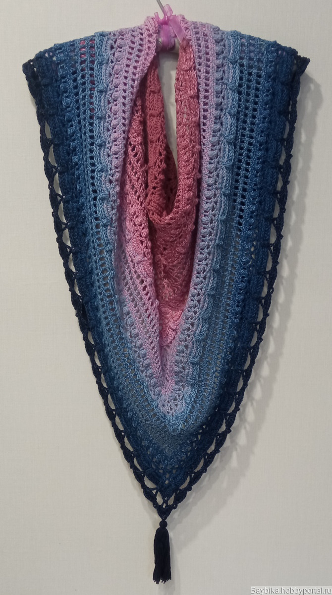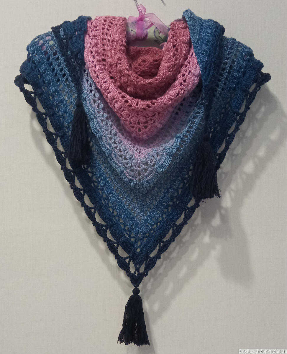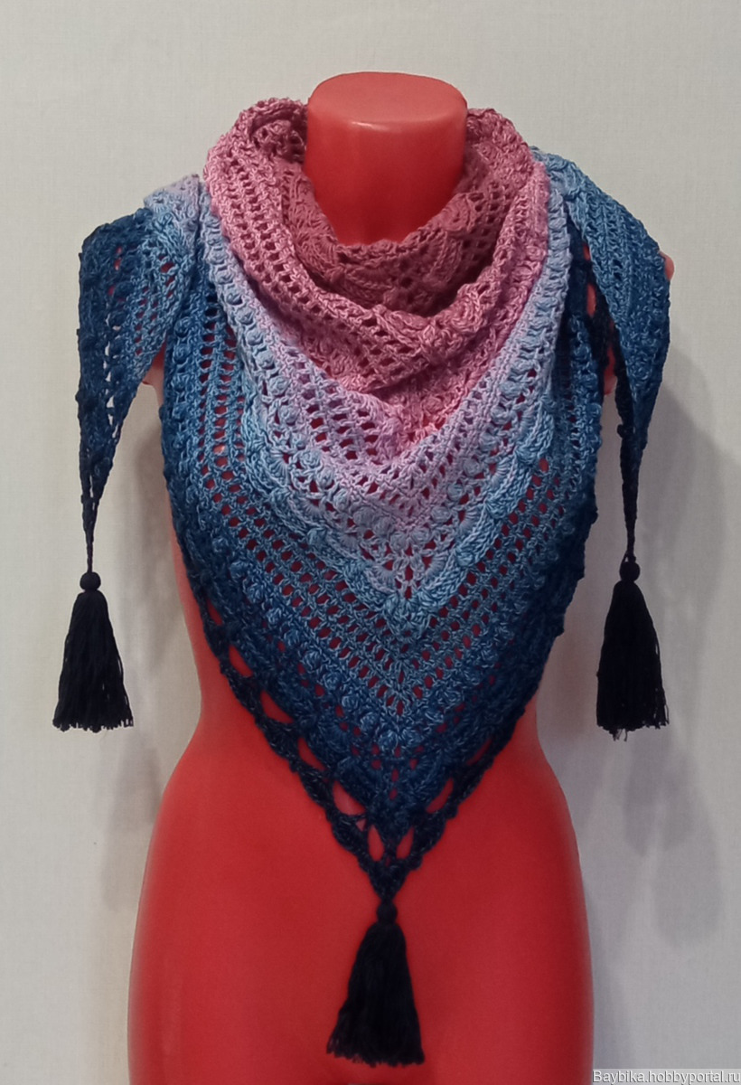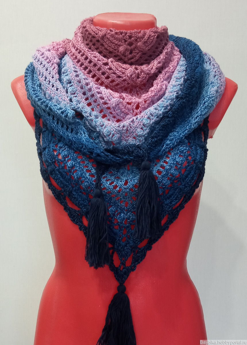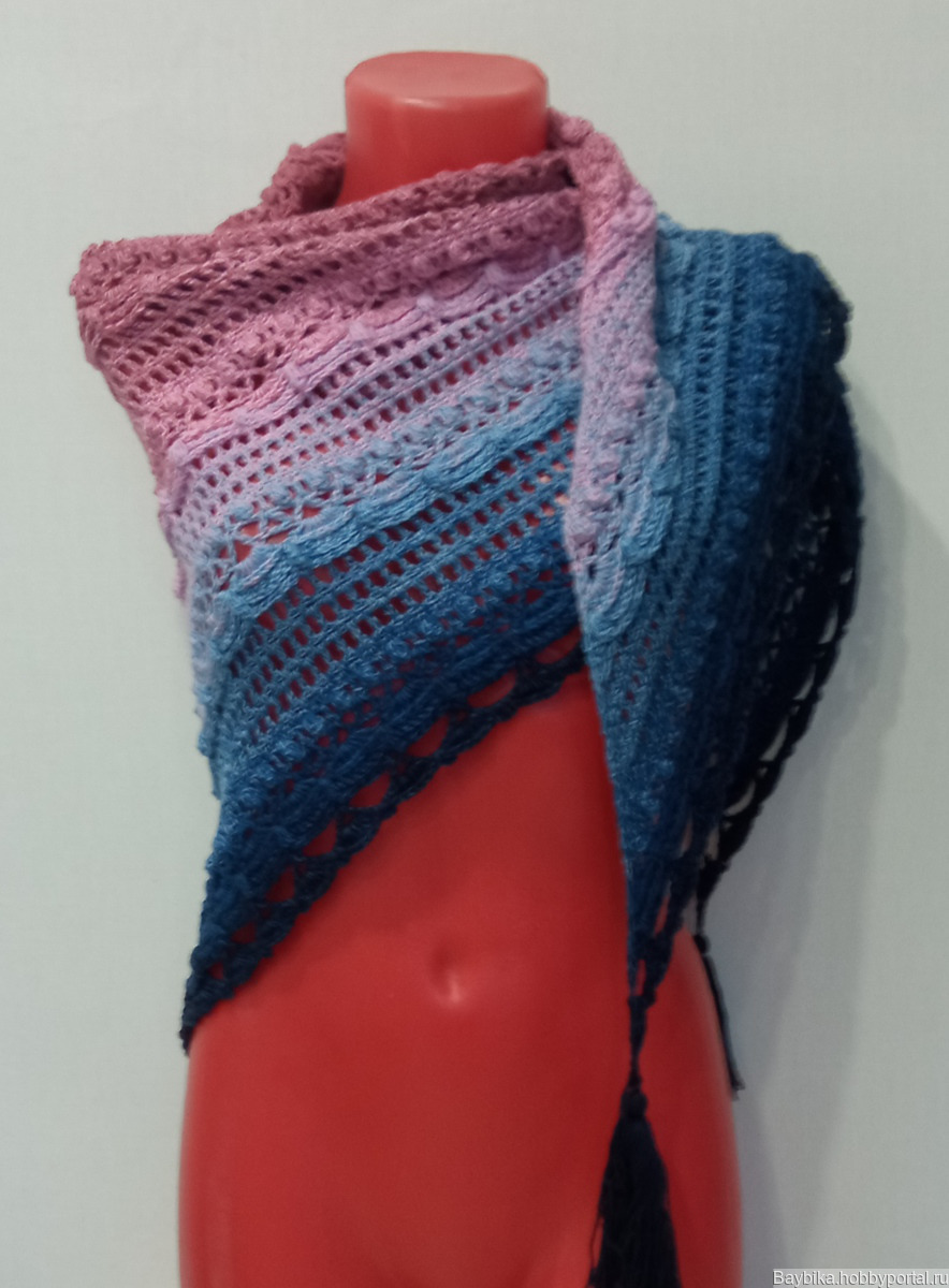 Вязаная шаль с кисточками, с удивительным объемным рисунком, связанная крючком по схеме "Затерянный во времени". Отлично смотрится с пальто, курткой, жакетом. Подходит для лета, весны, осени. Этот цвет очень хорошо смотрится с джинсовой одеждой. Размер составляет160 см на 80 см.