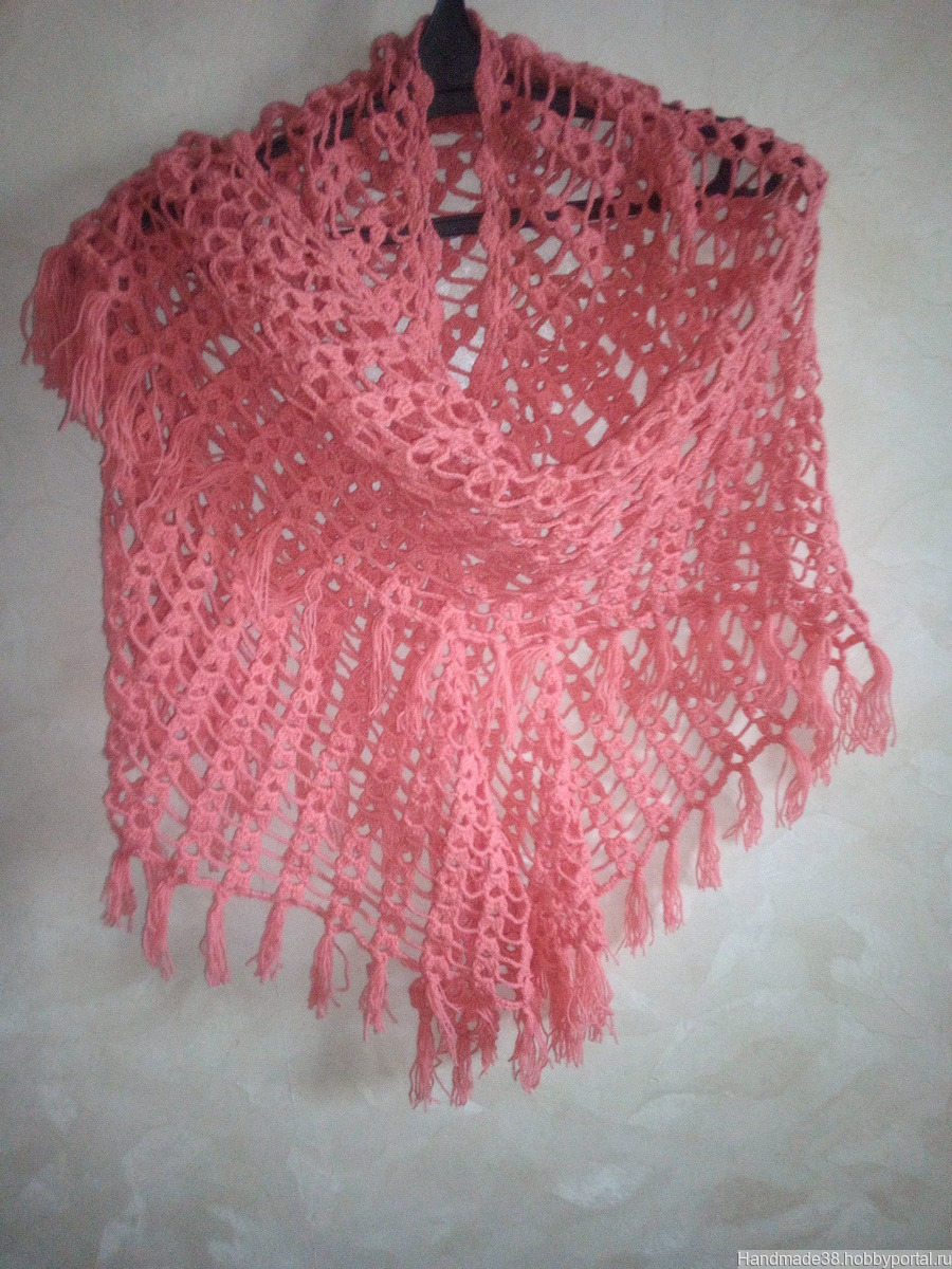 Шаль связана из акриловой пряжи "Пчёлка",цвет-св.азалия.Очень красивая шаль.Великолепный подарок на НГ.Работа готова к продаже.Доставка:самовывоз из Люберец или отправка почтой после предоплаты(цена+почт. расходы).