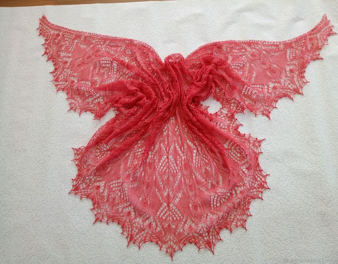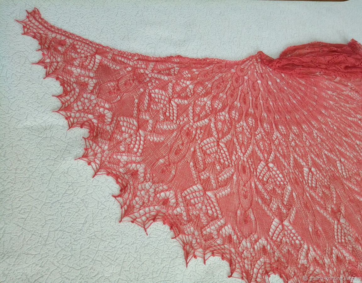 Ажурная, элегантная, нежная и воздушная, и в то же время теплая шаль. Легкая и невесомая, всего 90 грамм, одновременно струящаяся как шелк и держащая форму , а также согревающая за счет кашемира и мериноса в ее составе, связана из итальянской нити всемирно известной фабрики Loro Piana. Цвет шали - теплый коралловый.