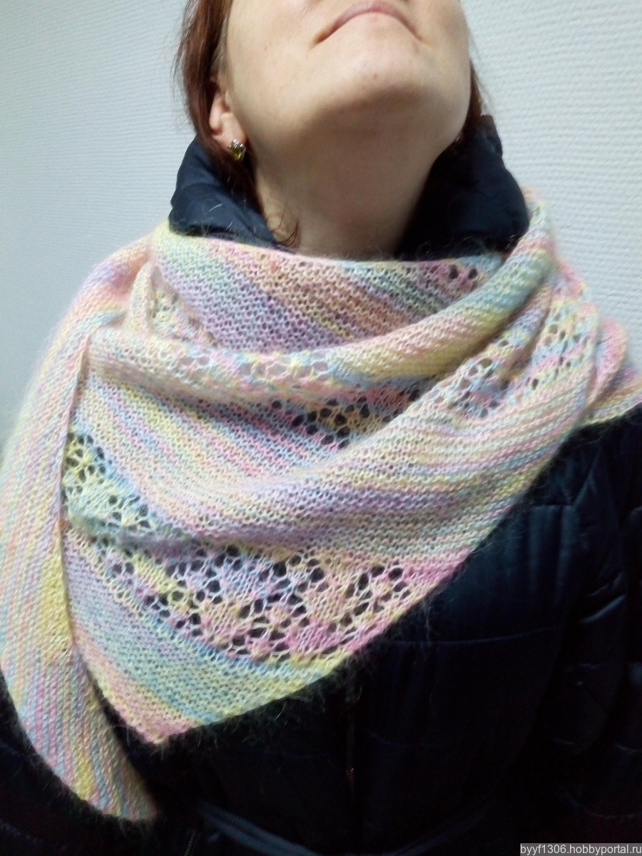 Необыкновенно теплая и яркая шаль-бактус связана спицами из пряжи с мохером. Тонкая. Легкая. Необычайно яркая расцветка. Прекрасно дополнит даже самый скучный костюм, пальто,танкер.