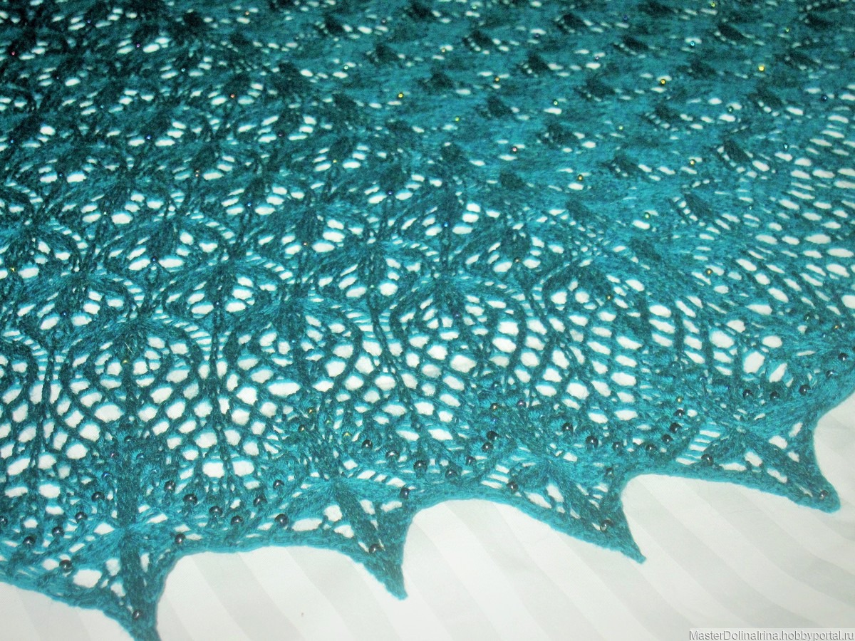 Шикарная ажурная шаль связана спицами из мериносовой шерсти изумрудного цвета с бисером в кайме. Мягкая совершенно не колючая и в тоже время такая теплая шаль.