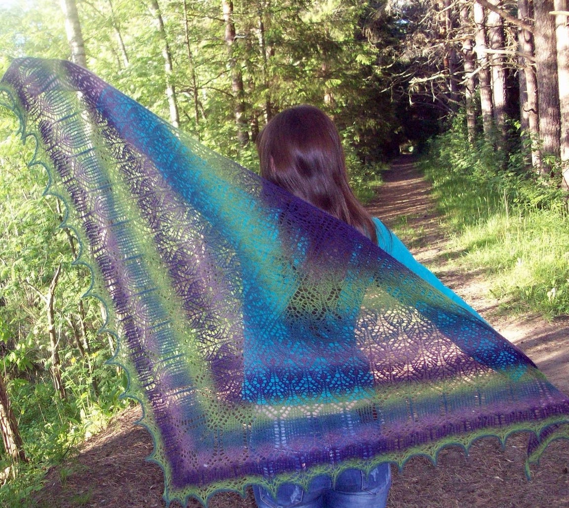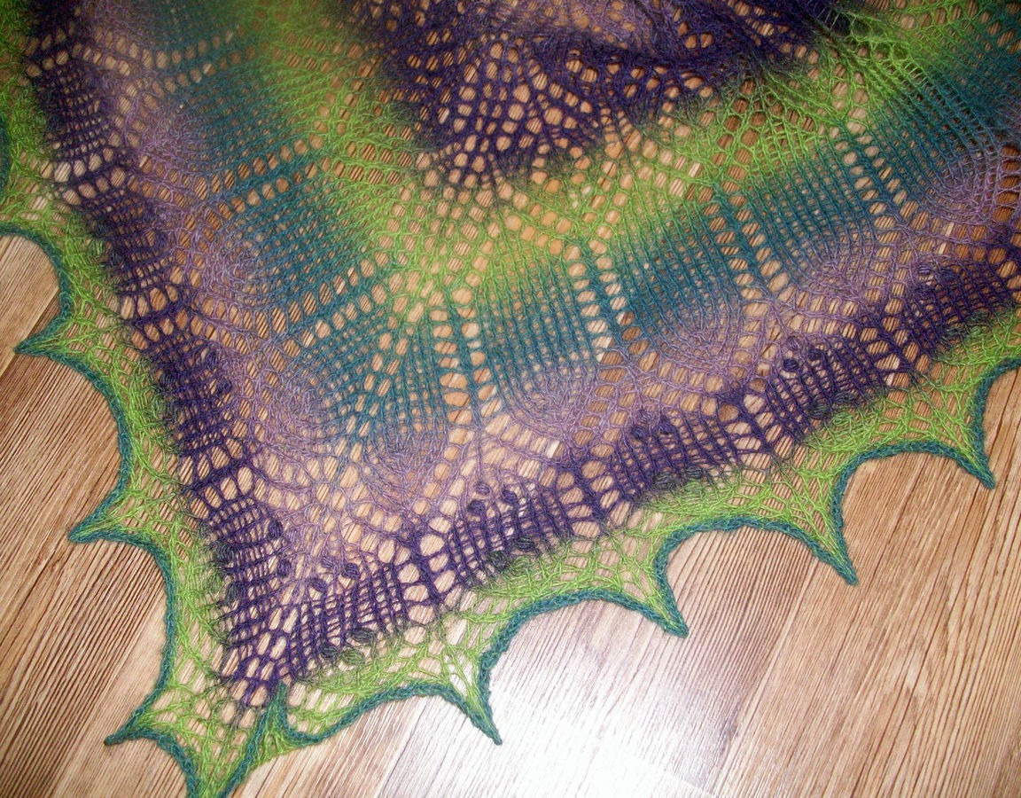 Возможно изготовление этой модели шали в любом другом цвете из натуральной исключительно высококачественной пряжи, преимущественно прибалтийского производства. Готовая шаль бережно выстирана вручную в теплой воде с нейтральными моющими средствами для шерсти; полоскание с кондиционером; отжим в полотенце, блокировка до полного высыхания.