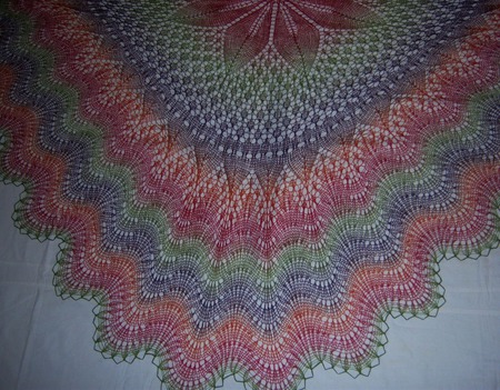 Размеры шали: длина от верхнего края до нижнего- 108 см, размах- 220 см.