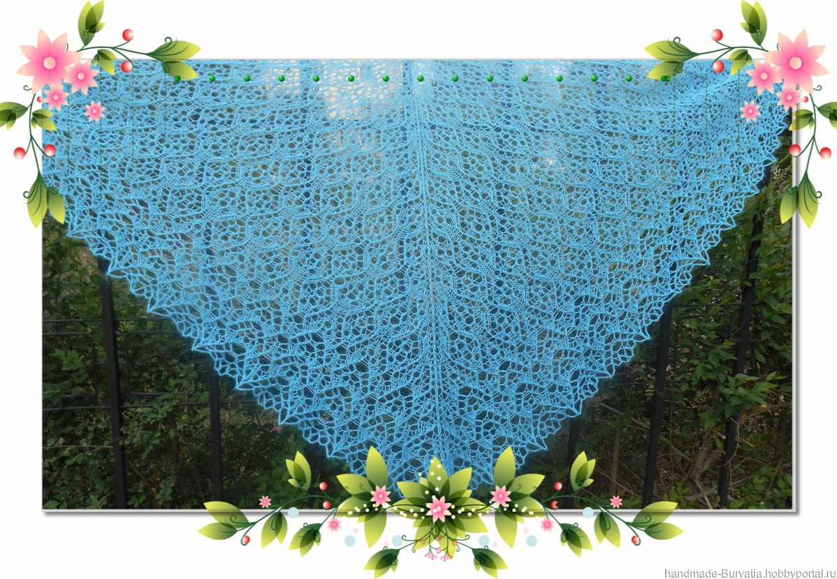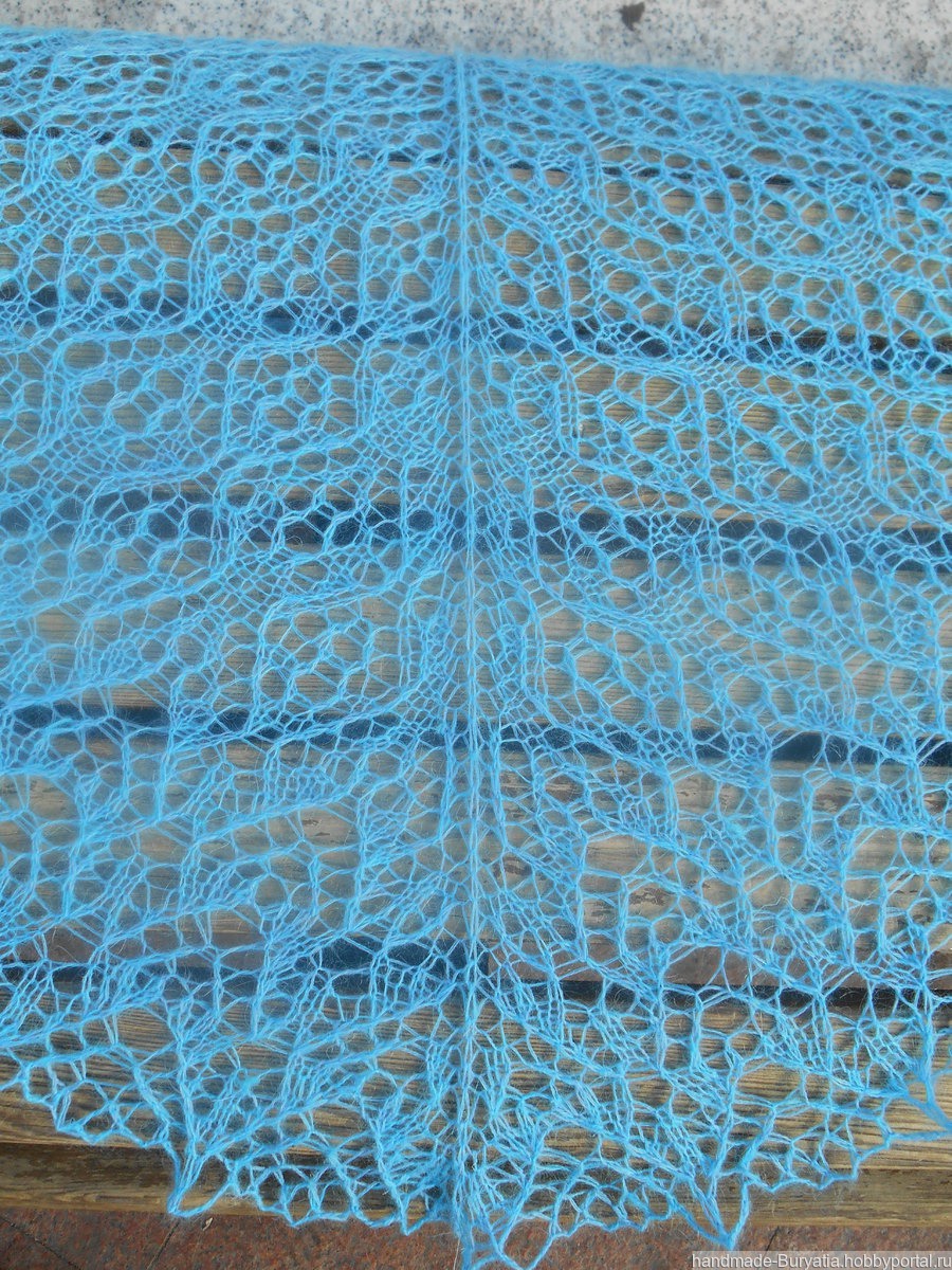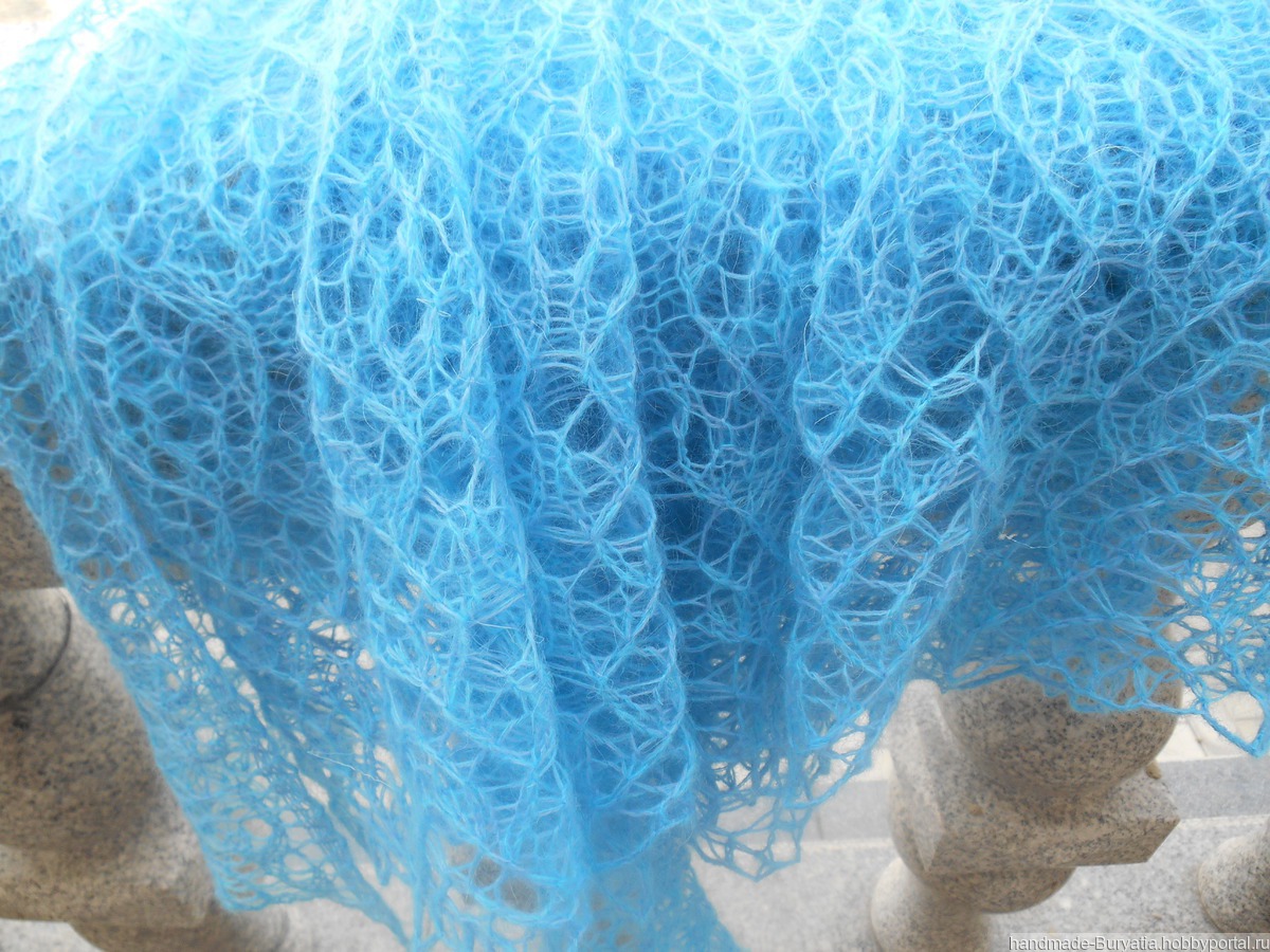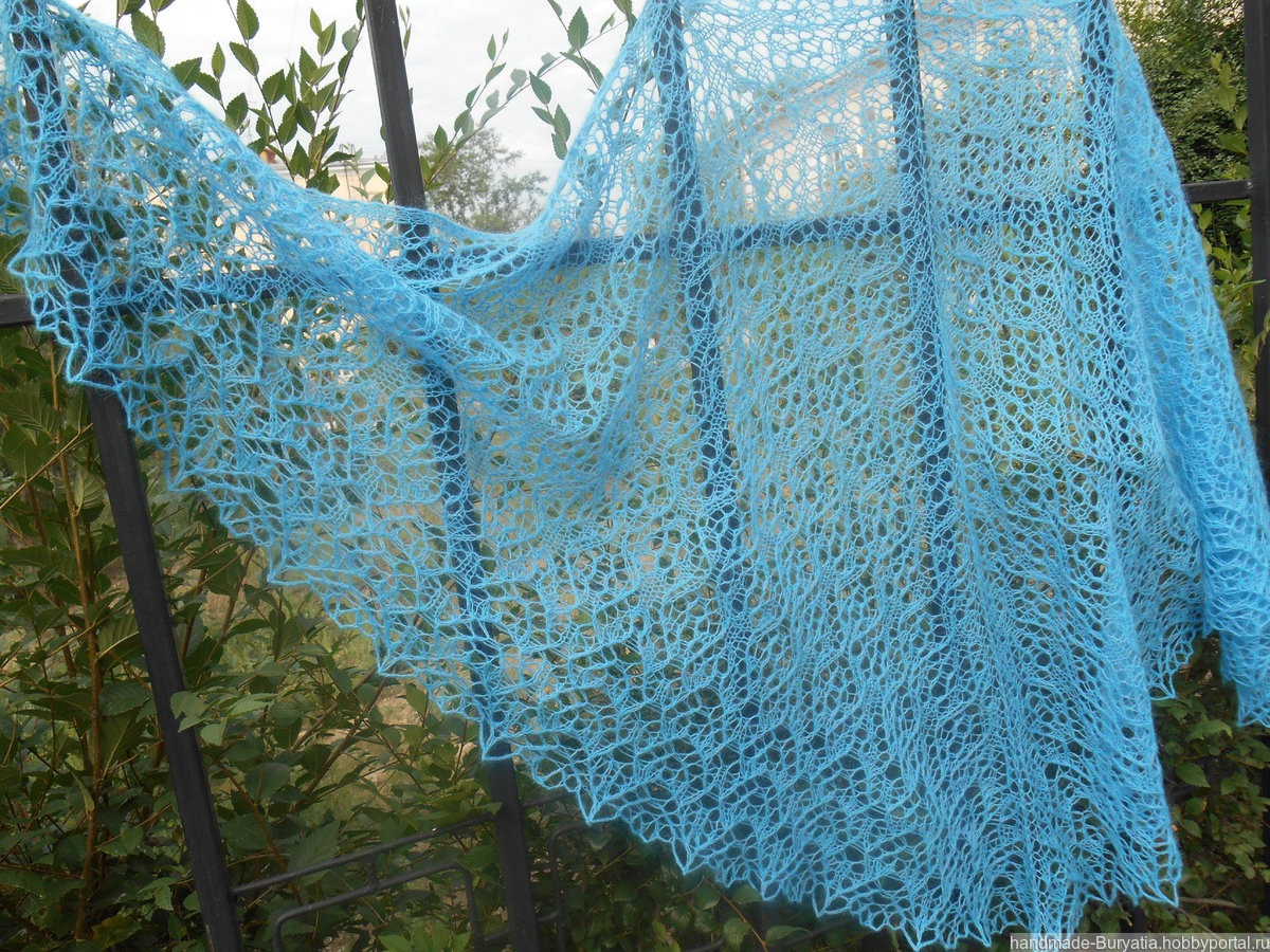Шаль треугольной формы. Пряжа в дуэте: Лидия Семеновская ч/ш 100 г/1613 м цвет голубой - 40 г. и Alize KID ROYAL 62% кид мохер /38% полиамид, 25 г/250 м цвет бирюза - 65 г.Общий вес - 105 г. Размер по ленточке 200 см, по центру 100 см.