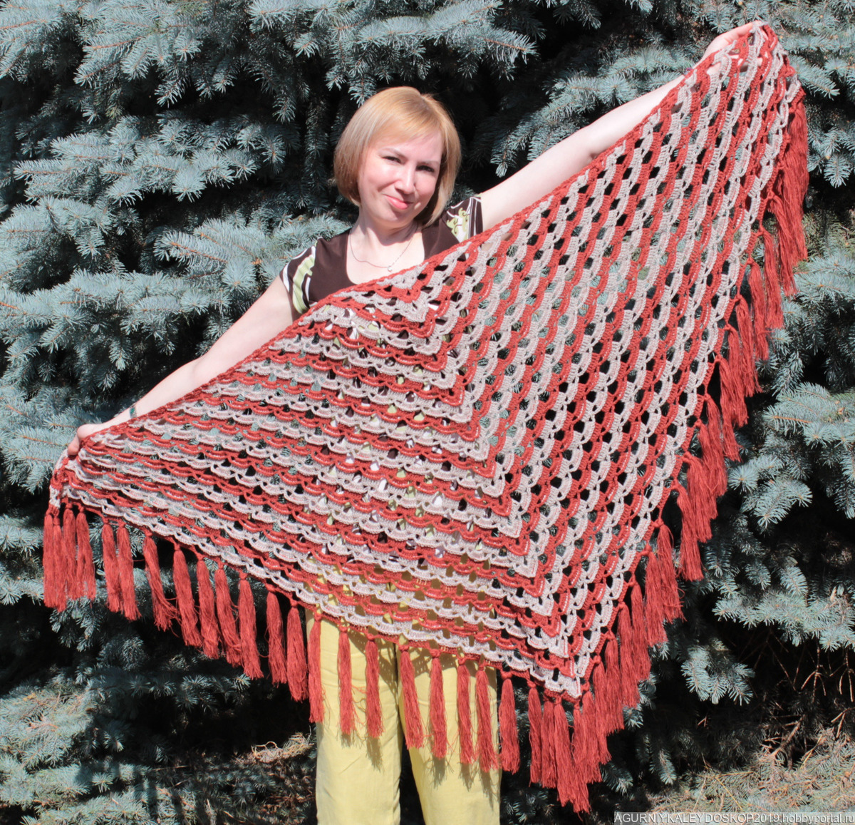 Шаль выполнена из тончайшей пряжи с использованием высококачественных красителей. Очень оригинальная модель с хорошо читаемым узором