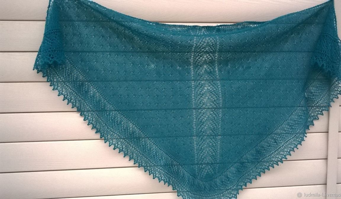 Шаль Мадлен связана спицами из тонкой шерстяной пряжи. Автор дизайна Ольга Ростовская.