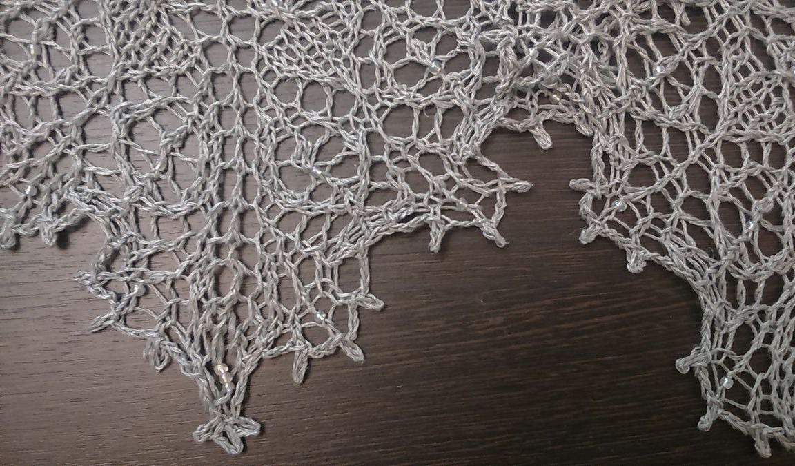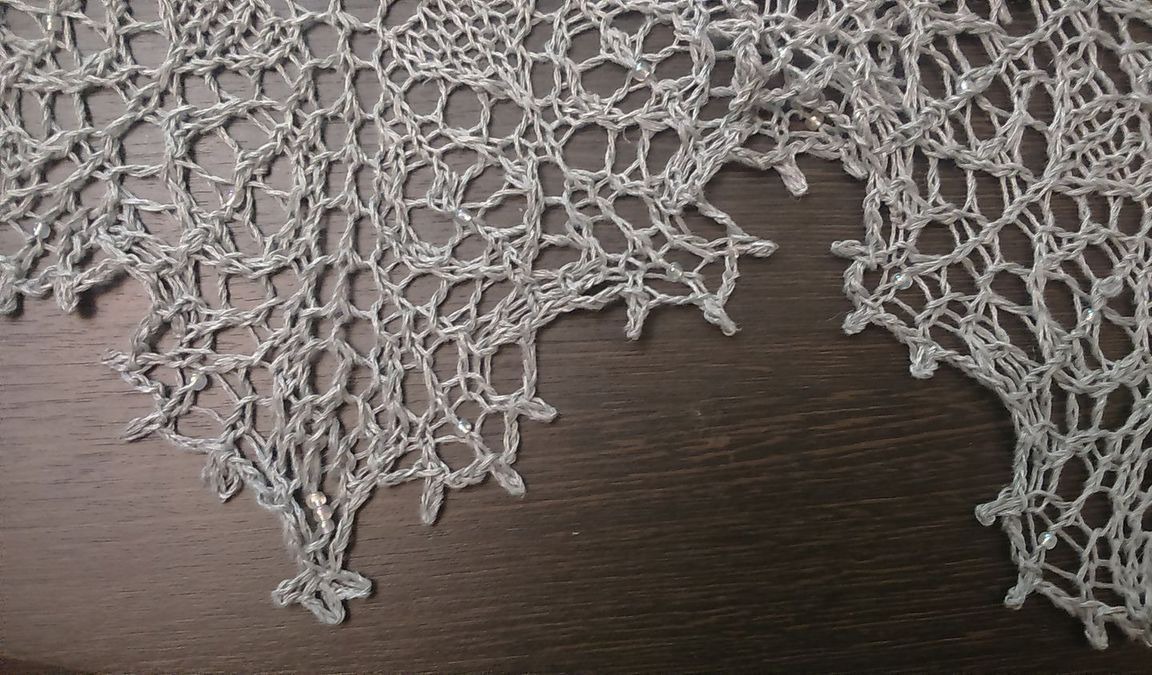 Ажурная шаль ручной работы. Выполнена изо льна. Украшена бисером. Вес шали 177 г, из ниъ 10 гр бисера. Материал этой шали согреет в холод, даст прохладу в жару. Замечательный аксессуар для прогулок летними вечерами. Прекрасный подарок.