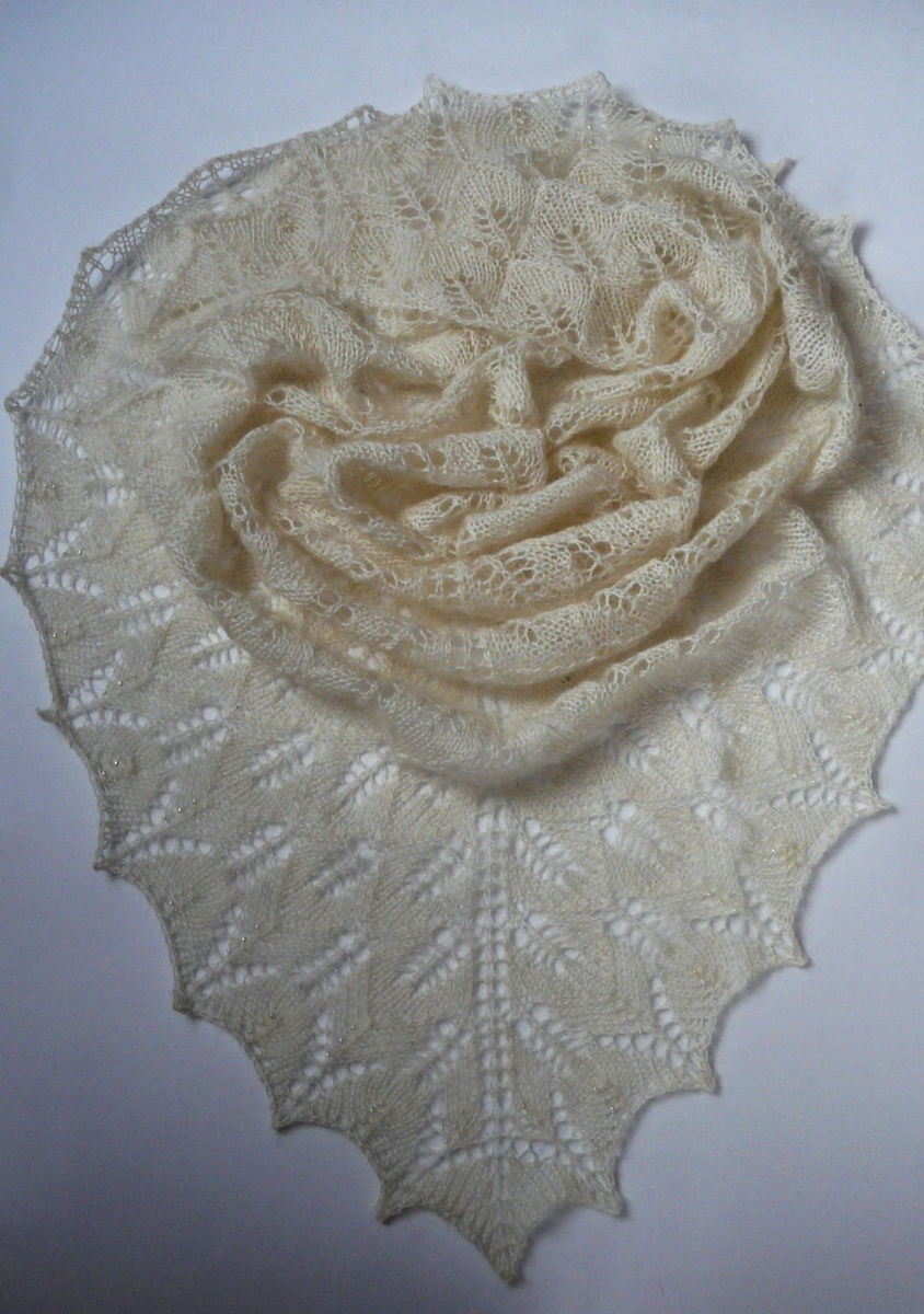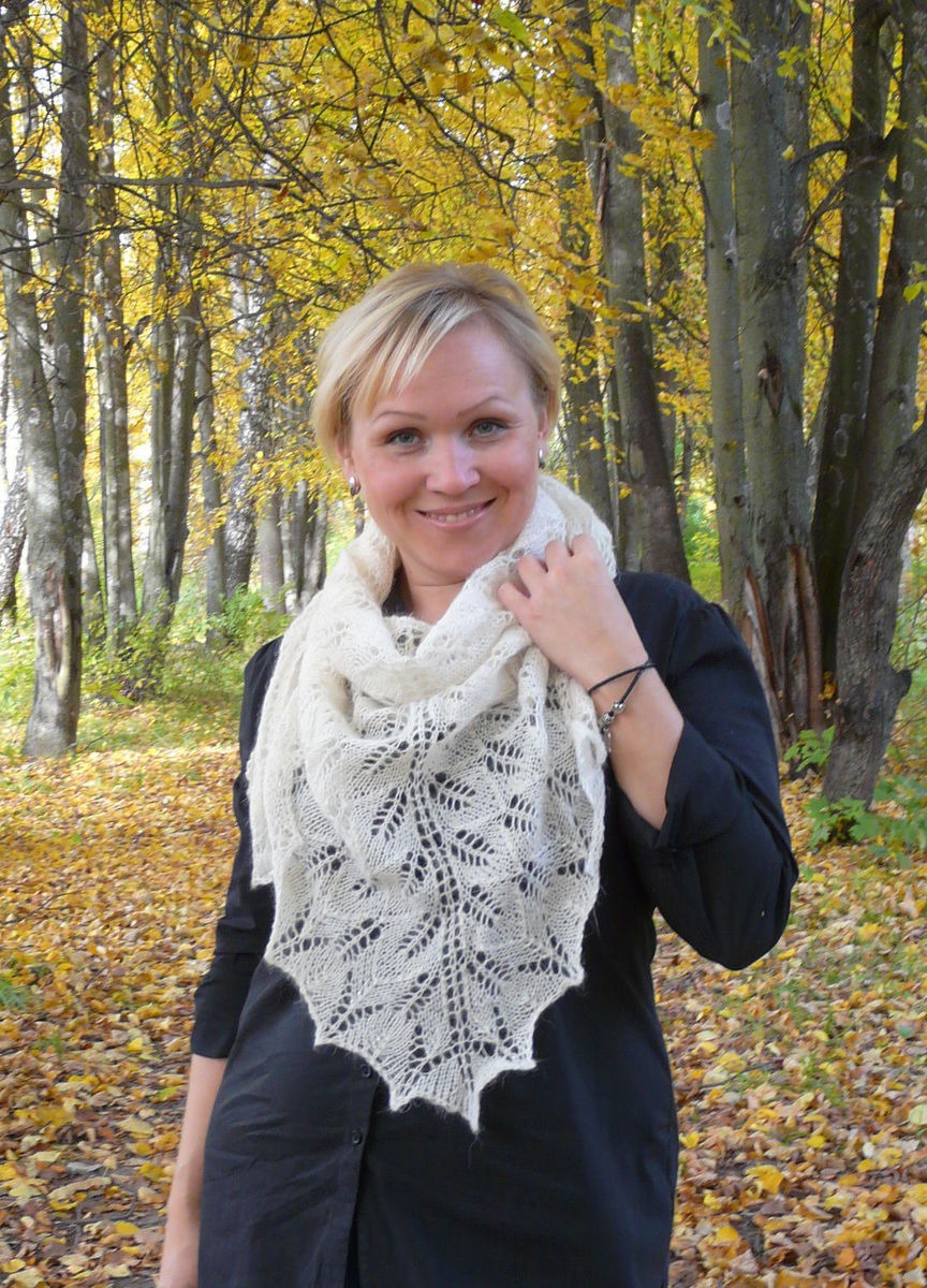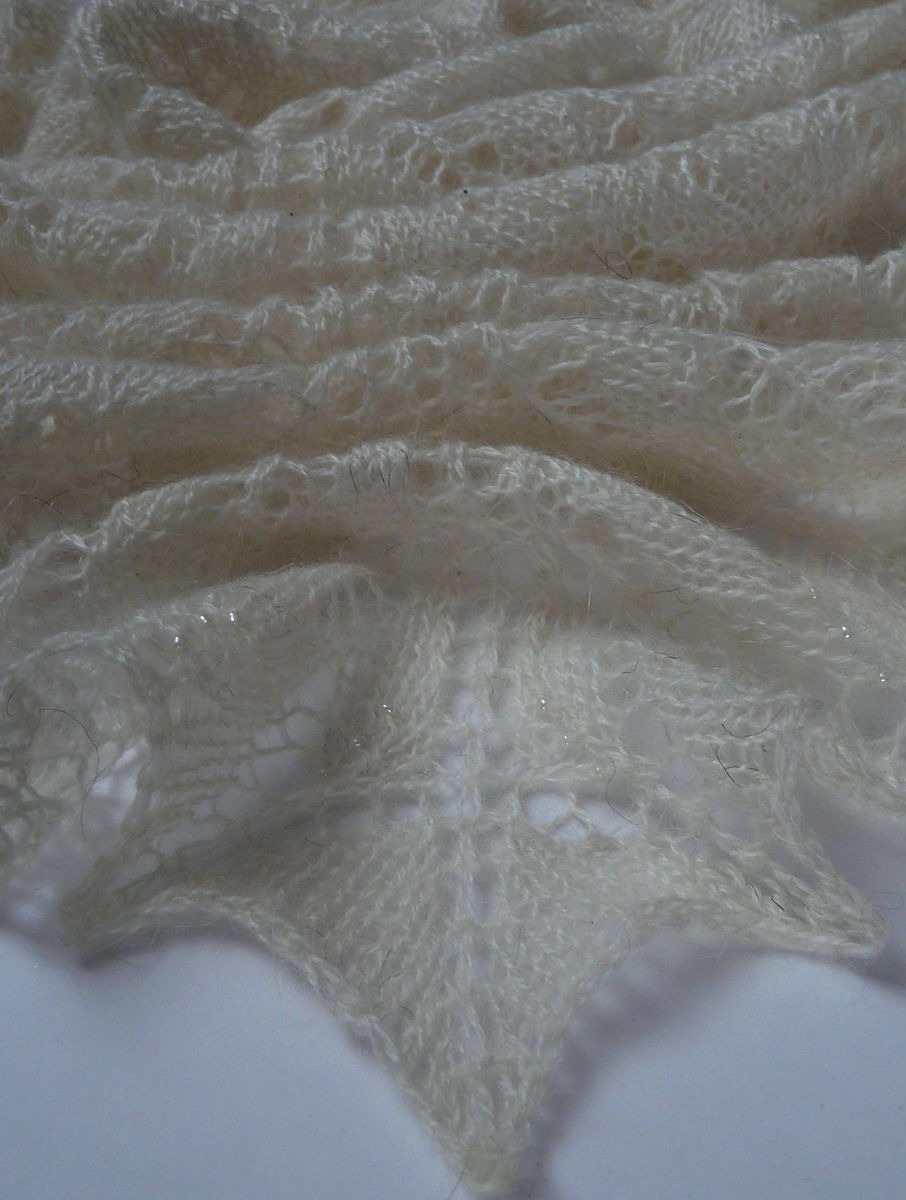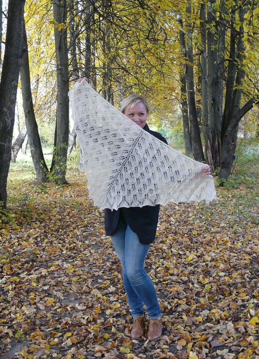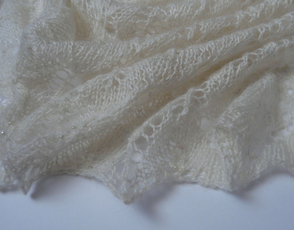Нежная пуховая шаль, украшенная лёгкими бисерными капельками. Тончайшая паутинка, лёгкая как пёрышко) Изящная ажурная вязка, нежный молочный цвет и вкрапления бисера - мимо девушки в такой шали трудно пройти, не обернувшись)))