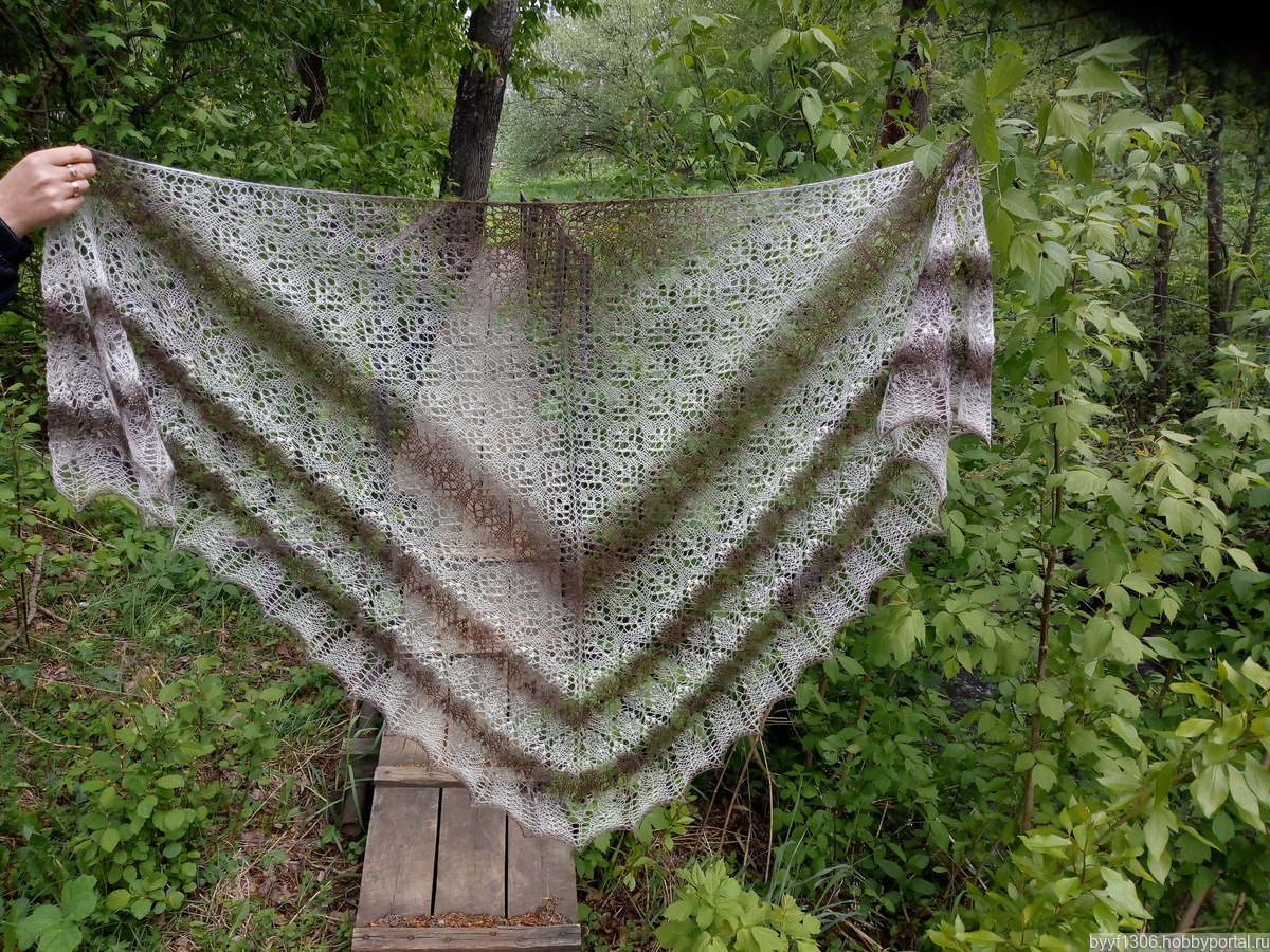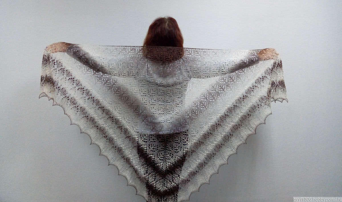 Шаль имеет треугольную форму, вяжется сверху вниз. Размеры готового изделия - 210/120 см. Окончательные размеры шали зависят от выбранного Вами материала.