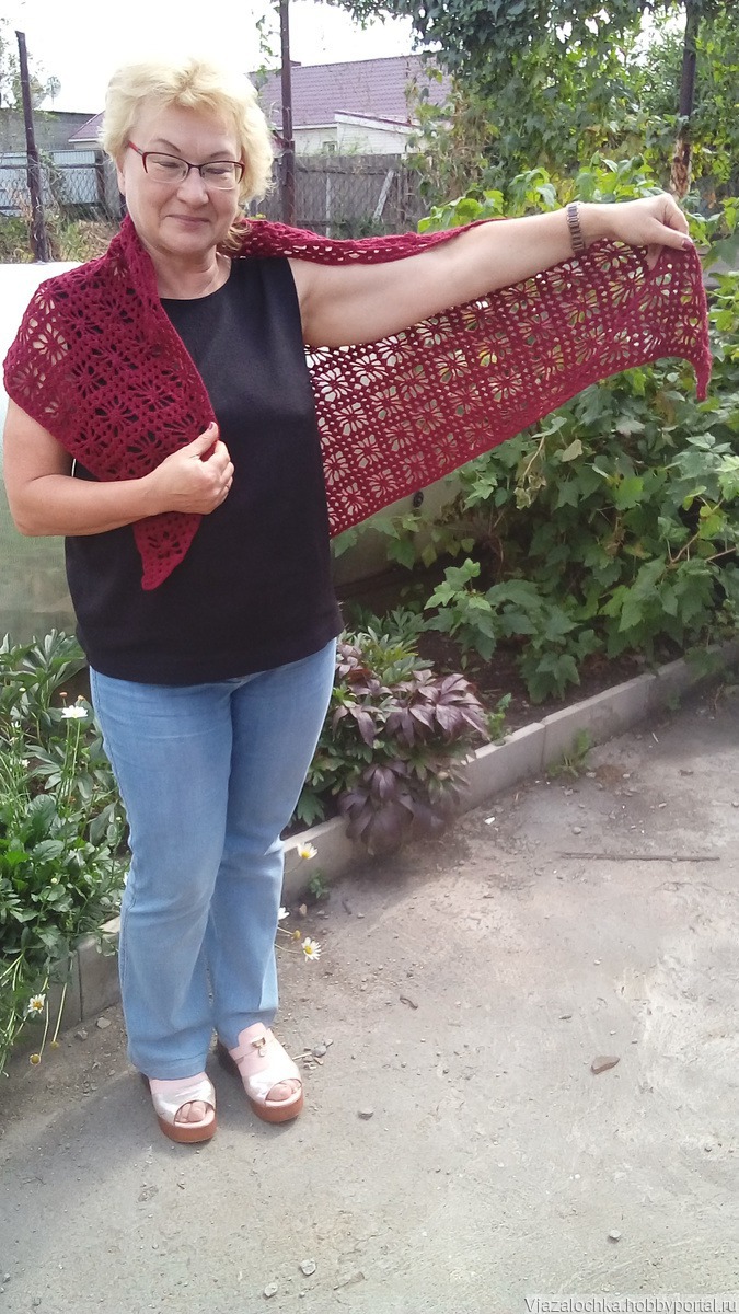 Шаль ажурная бордового цвета, выполнена крючком. Согреет Вас дома, на отдыхе, на работе и просто порадует. Станет приятным сюрпризом для любой женщины в качестве подарка.Шаль - это не просто вязаный платок, а та часть одежды, которая задает тон всему наряду.