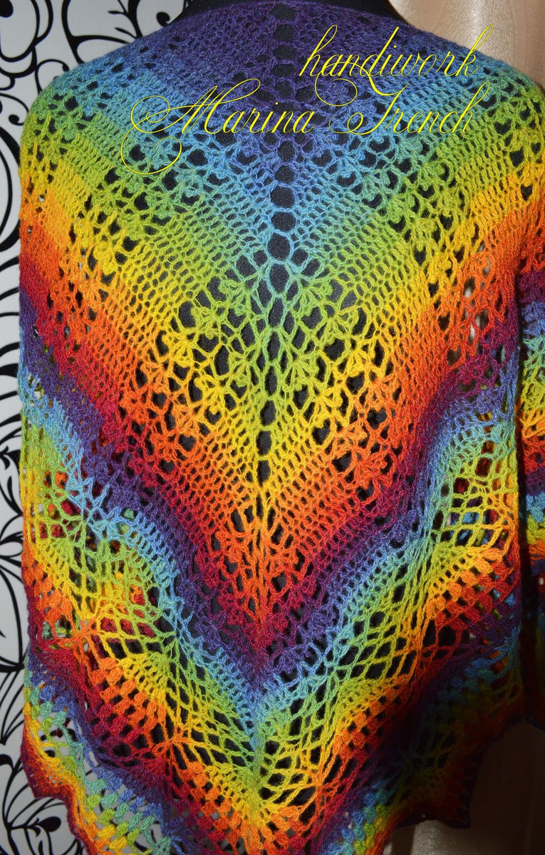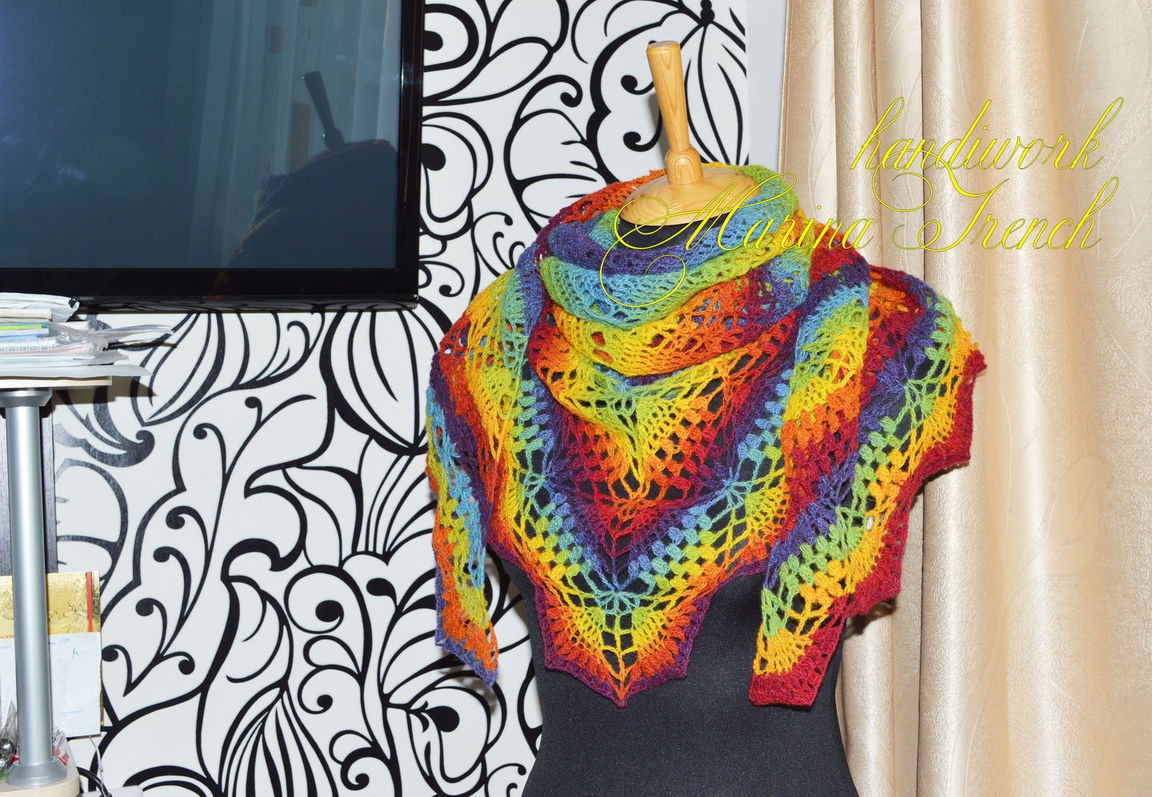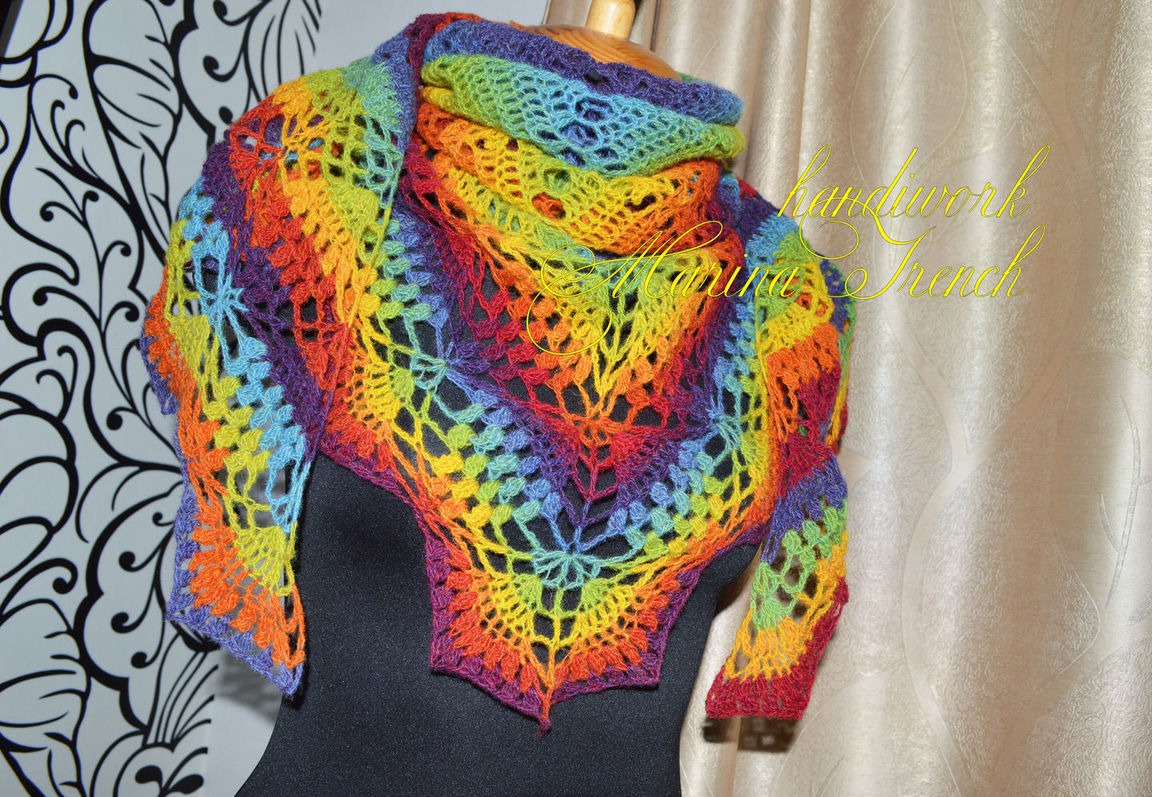 шаль, фишу, радуга, шаль крючком, шерсть 100%, шаль из кауни, фишю, вязанная шаль, радужная