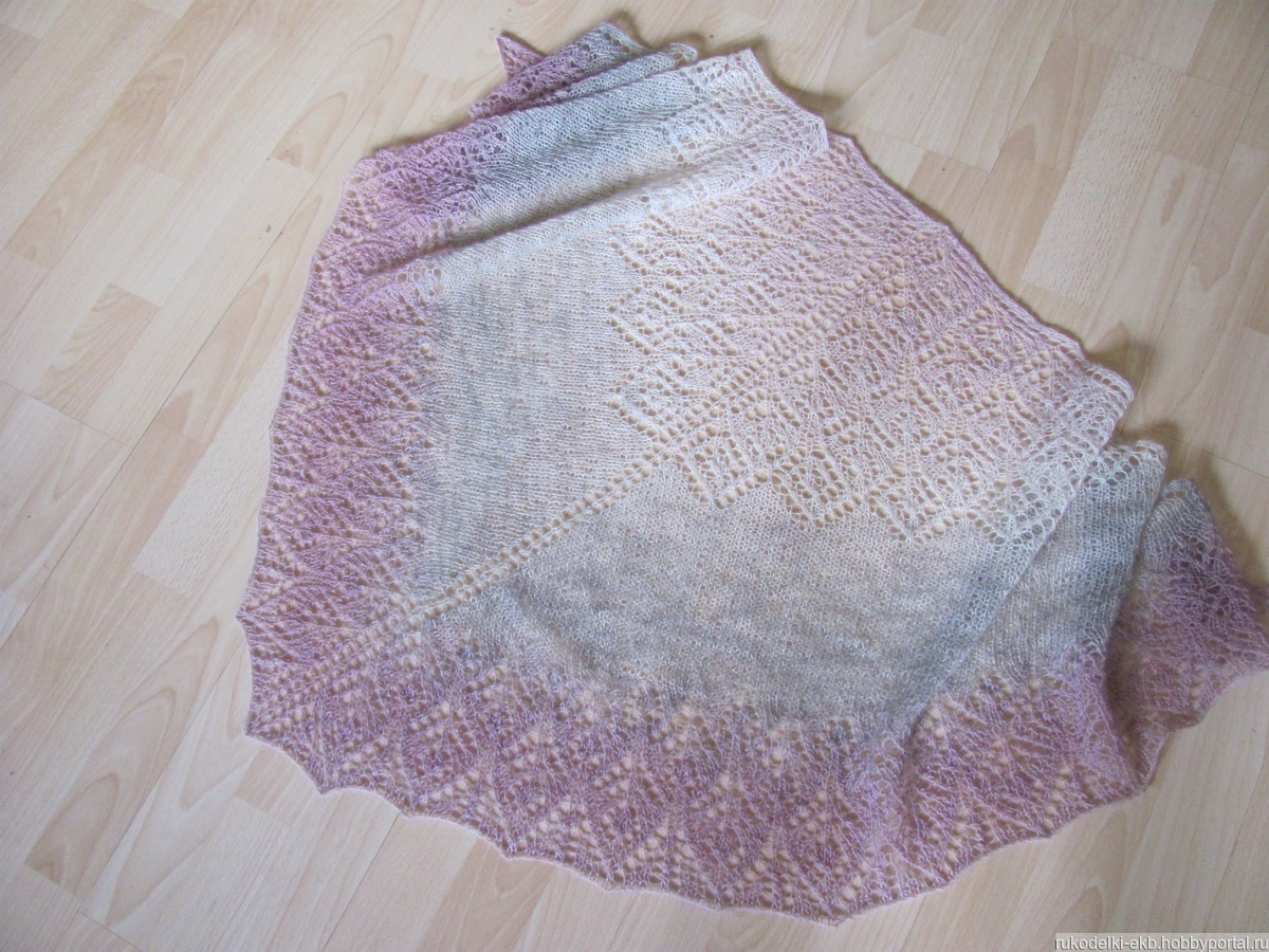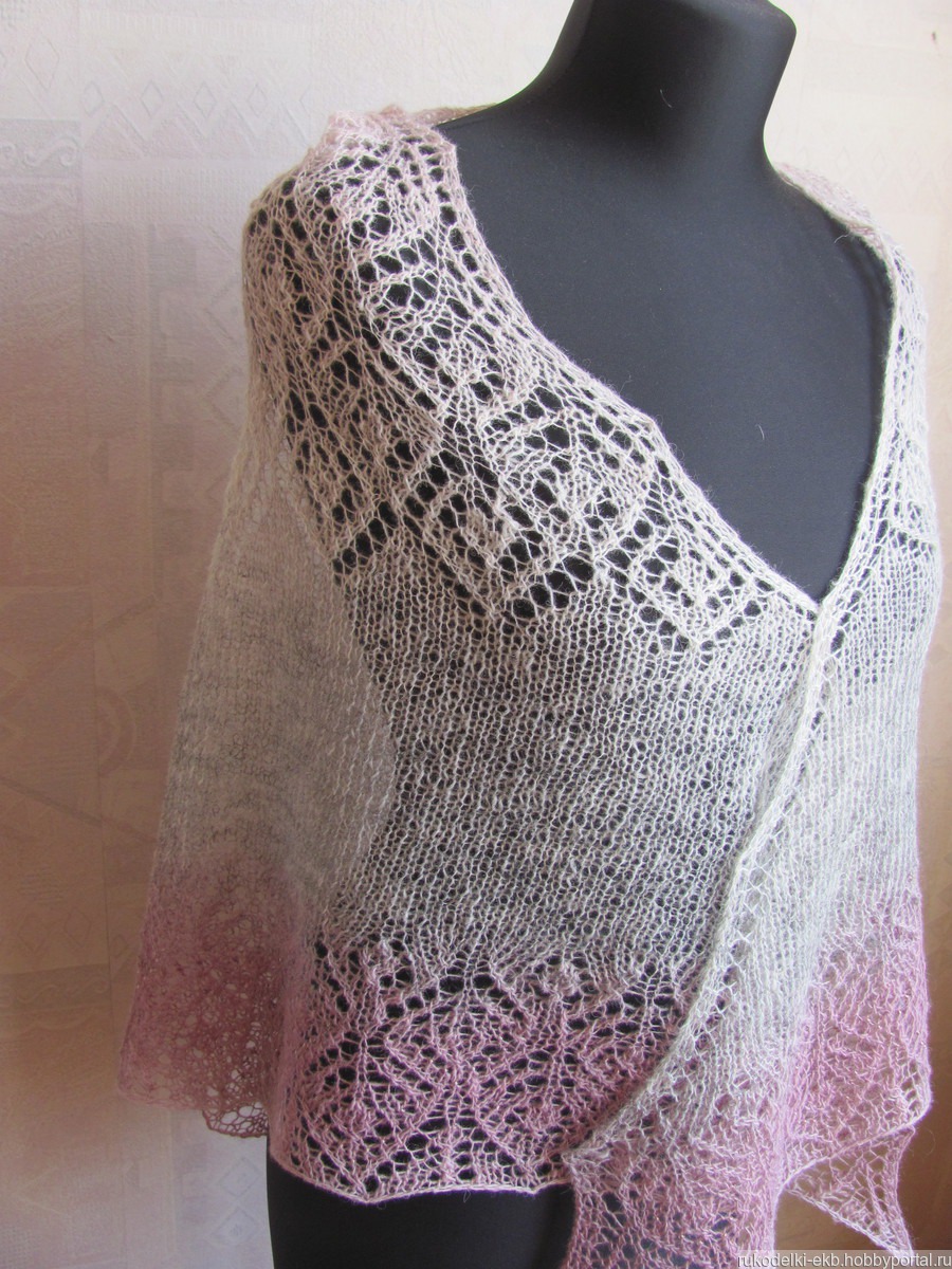Нежнейшая шаль София выполнена спицами из пряжи Кауни (100 % шерсть). По низу ввязан бисер. Плавные переходы цвета серо-розовой гаммы приятны для глаза.