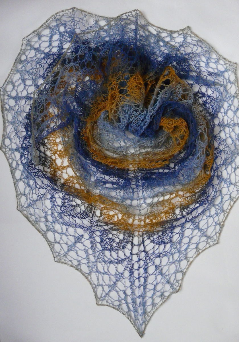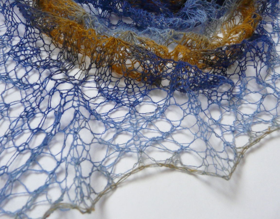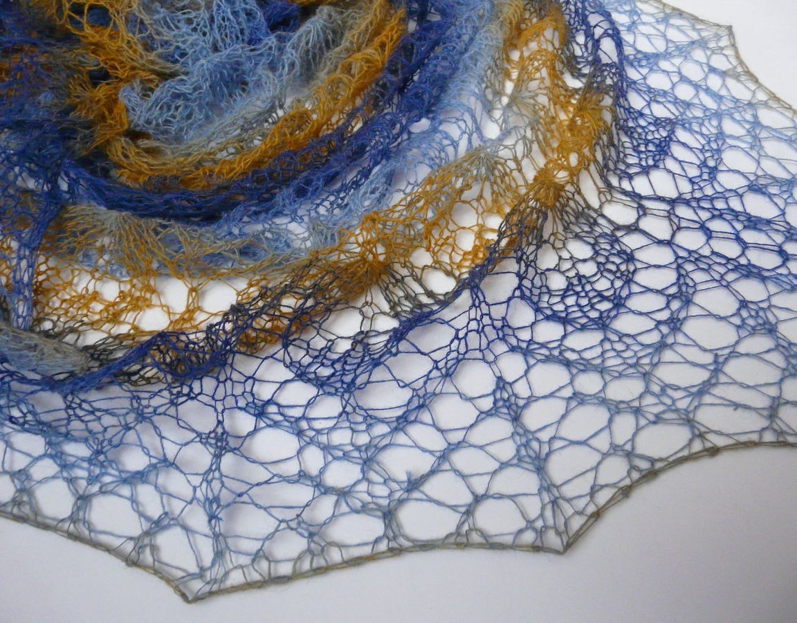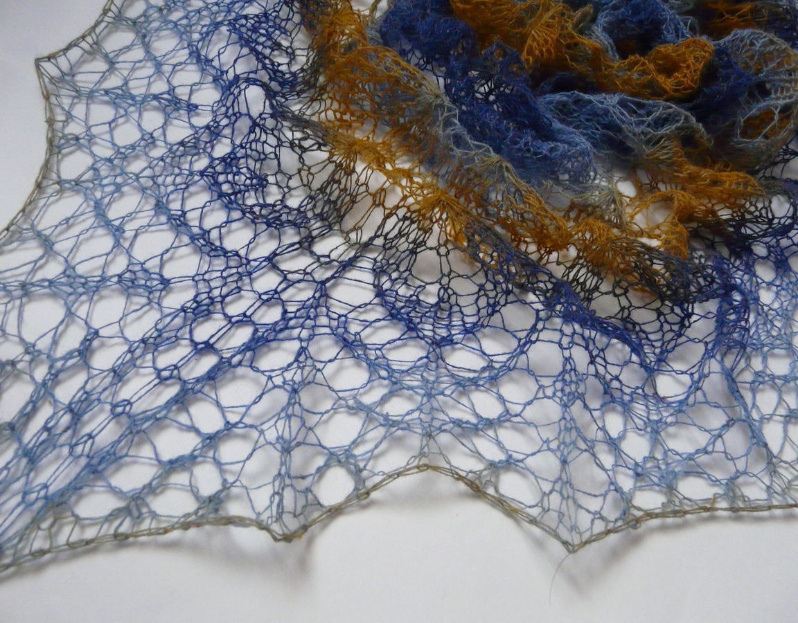 Абсолютно прозрачная, невесомая, полностью ажурная шаль связана из нежной литовской овечьей шерстки достаточно редкой расцветки. Ассоциация - осеннее ярко-голубое небо и листва) Очень красивая, тонкая, но очень тёплая - лучший подарок для себя или близких)