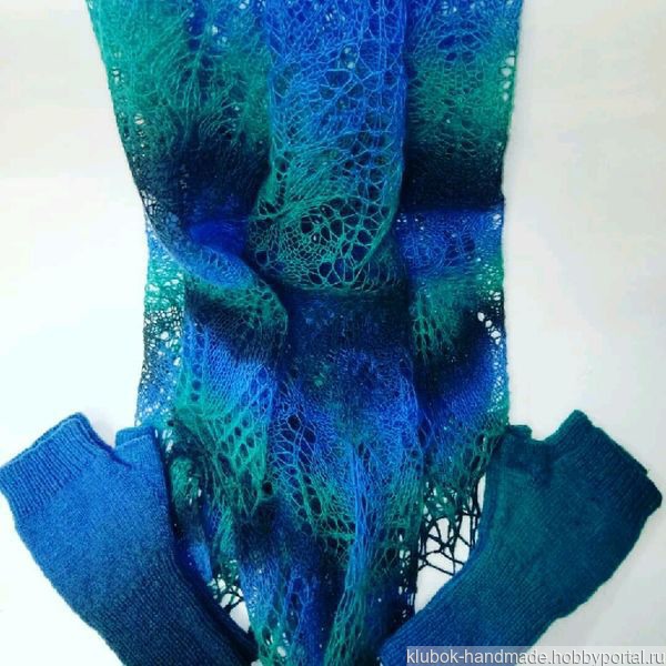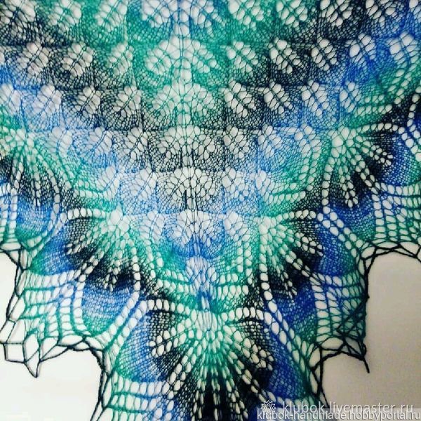 Легкая,ажурная шаль связана спицами из тонкой пряжи 8/1 (800м/100гр), шаль получается воздушной невесомой , которая поражает не только красотой переходов цвета и виртуозным, тончайшим переплетением нитей, но и своей теплотой- нежной и обволакивающей.