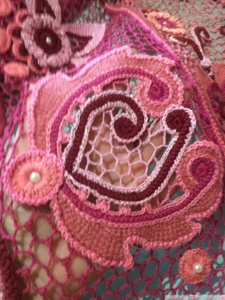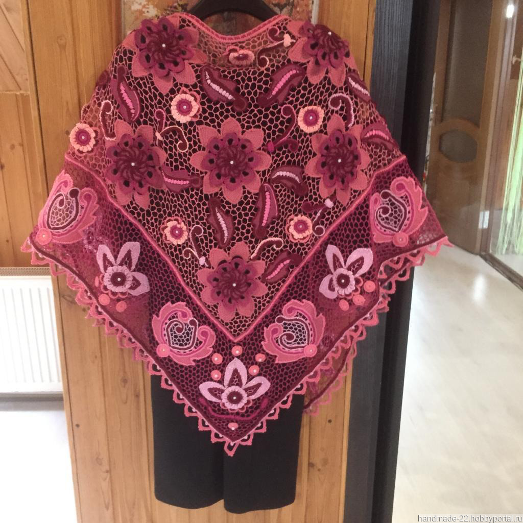 Обладательница этой великолепной ажурной шали, выполненной в технике ирландского кружева, будет всегда ловить восторженные взгляды прохожих. В основе этой шали лежат красивые большие плоские цветы, которые не предают шали объем, что очень важно для многих женщин.Все эти цветы: большие и маленькие,и фантазийные листья соединяет розовая сеточка,которая придает изделию изящество и благодаря такому соединению, изделие не деформируется, и после стирки имеет свой первоначальный вид. Края шали украшены фантазийными узорами, напоминающие восточную сказку. Все эти элементы связывает сеточка цвета спелой вишни.
