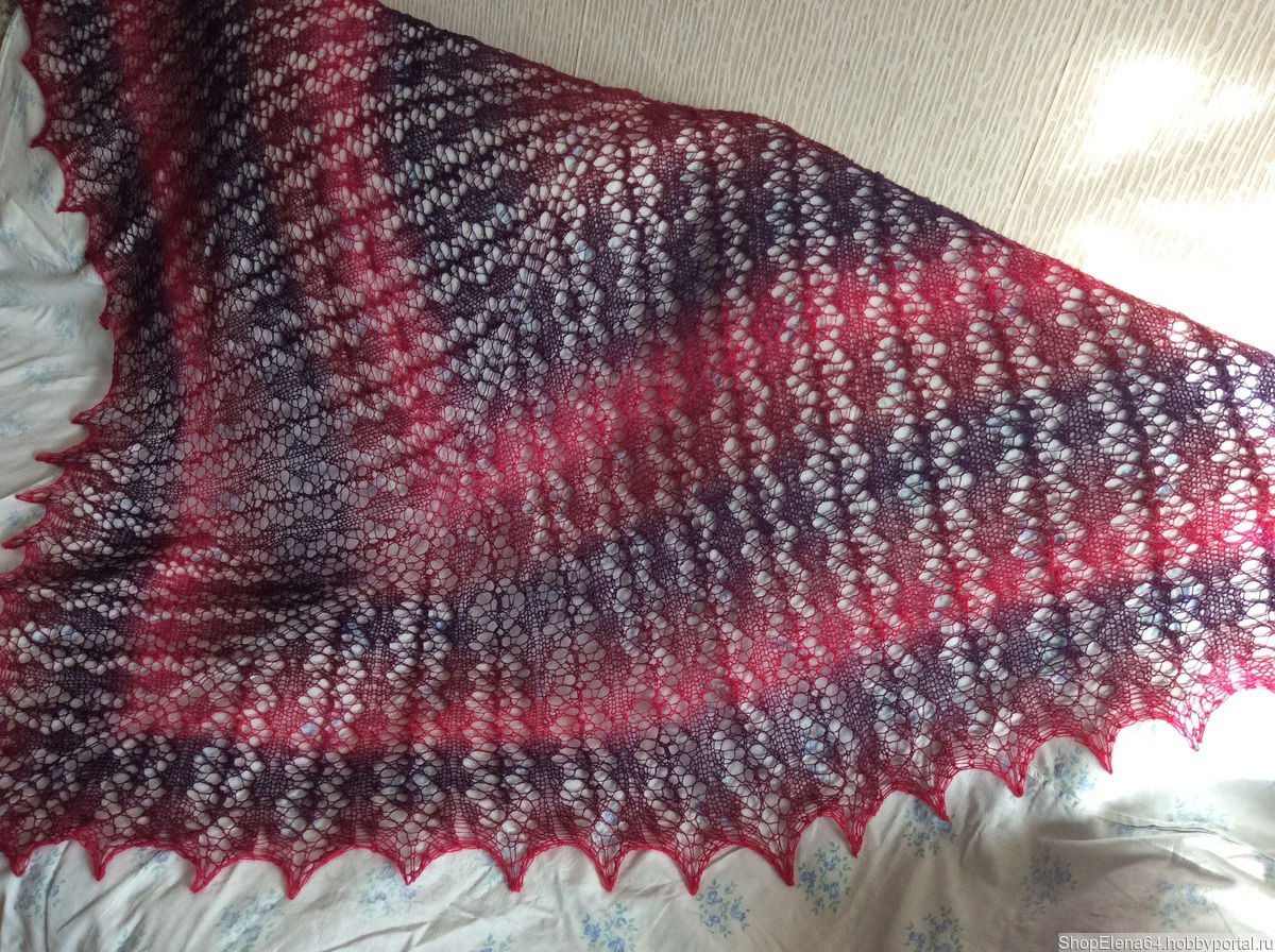 Шаль связана спицами из Кауни (100% шерсть, 800 метров в 100 граммах). Размер 115 см. на 230 см. Вес 120 грамм.