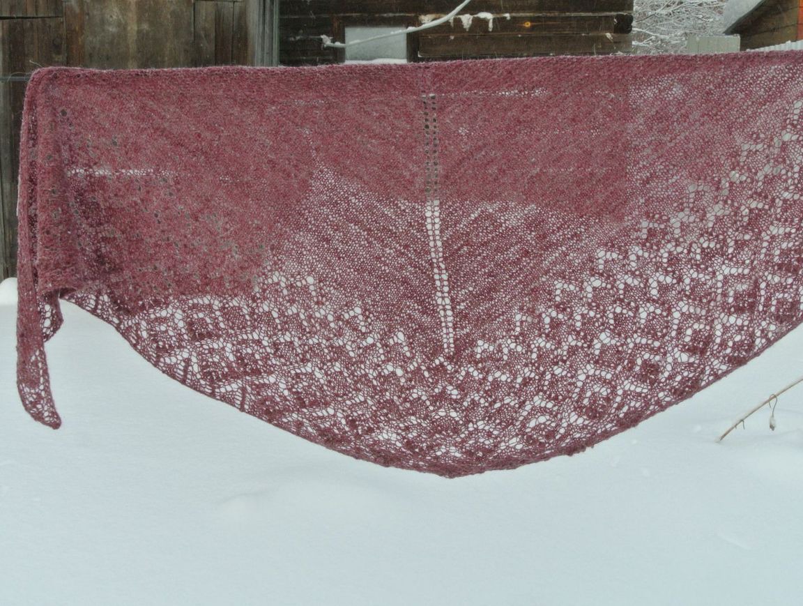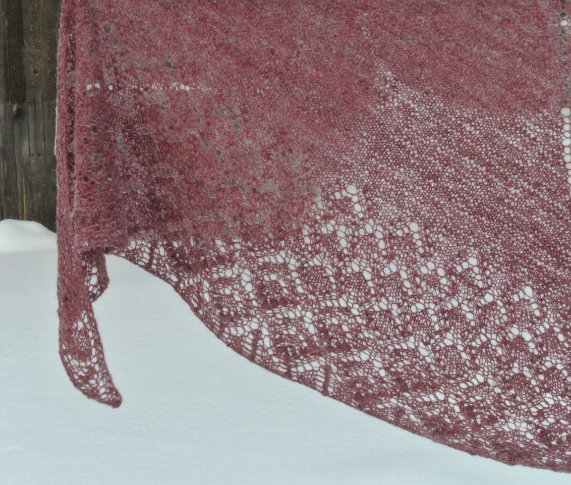 Полукруглая шаль "Яблоки на снегу" связана спицами из 100% шерсти.