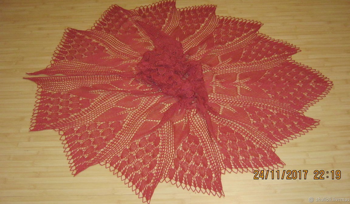 шаль спицами, подарок женщине, шаль ажурная, шаль в подарок, шаль ручная работа, шаль вязаная, коралловый, шаль ручной работы, шаль из шерсти, стильный подарок