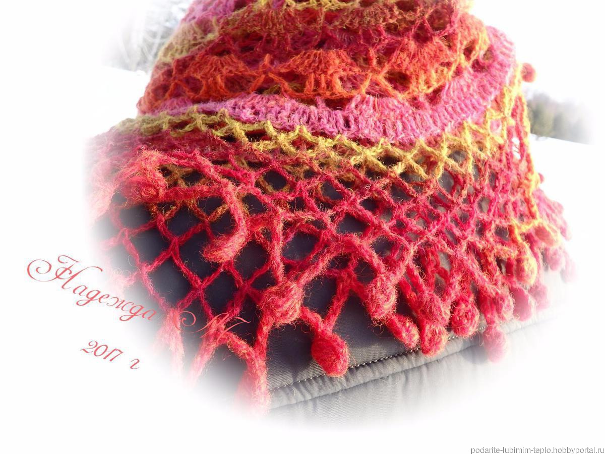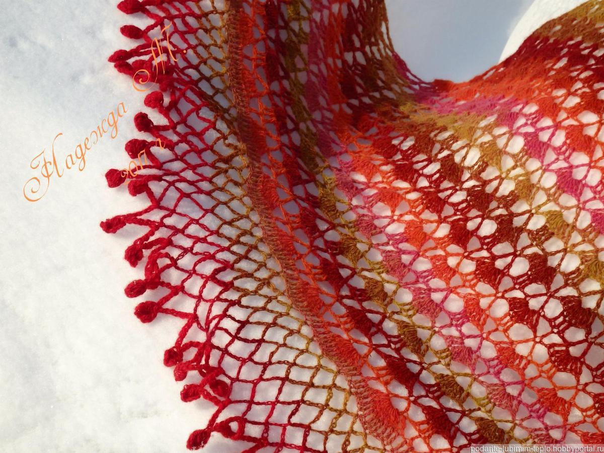 Большая, нарядная, теплая, ажурная шаль связана крючком.