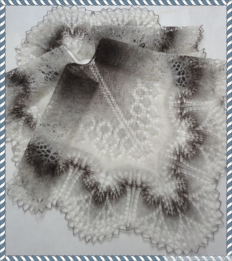 Шаль-фишю, имеет очень удобную серповидную форму, что не даёт ей спадать с плеч во время движения, очень легкая, вес примерно 60гр, цвет коричневый-белый, размер по верхнему краю 142см, по центру 65см, выполнена из 100% овечьей шерсти.