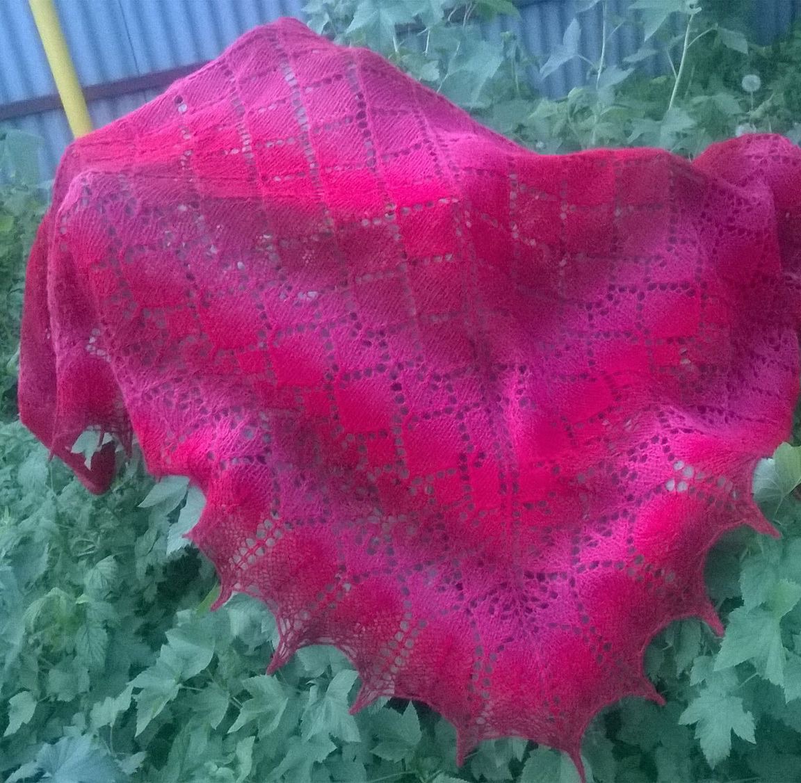 Шали могут быть связаны на спицах из тонкой однотонной пряжи или пряжи секционного крашения.