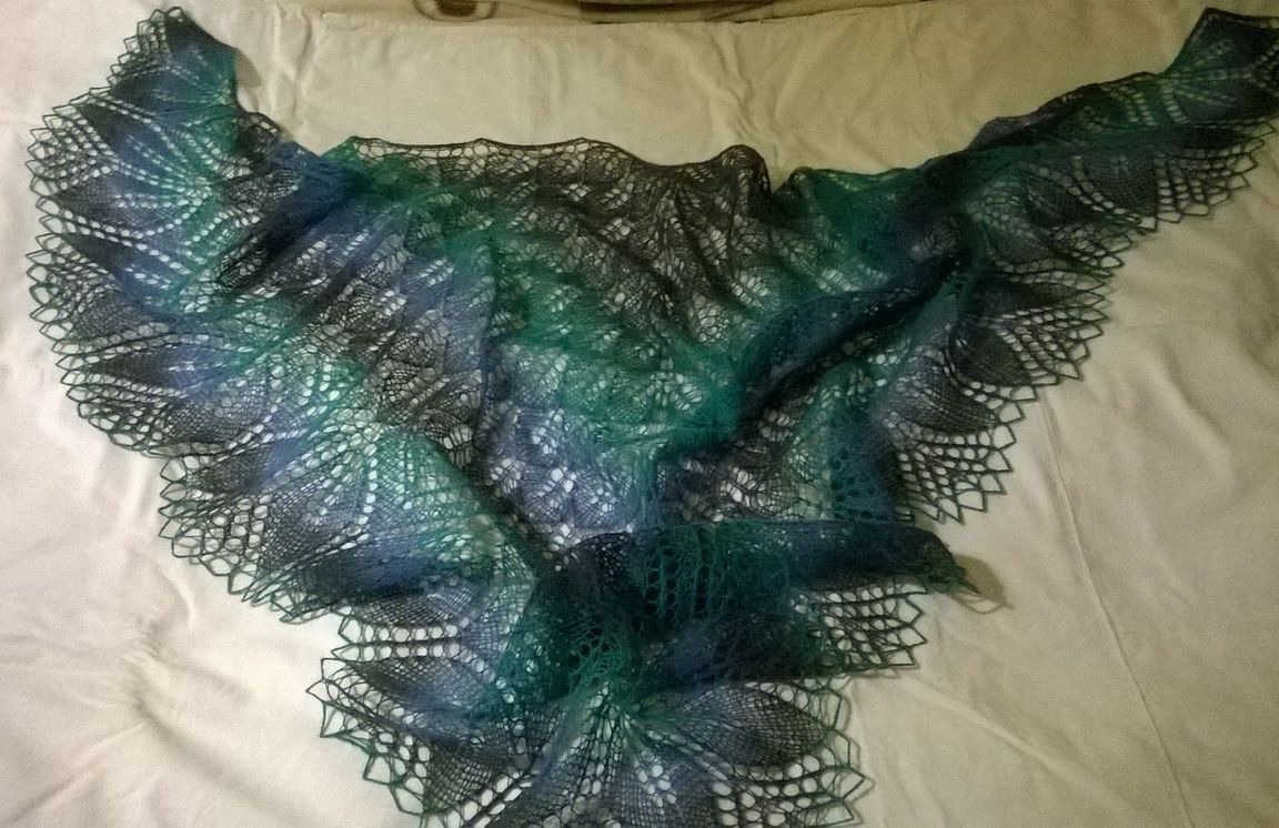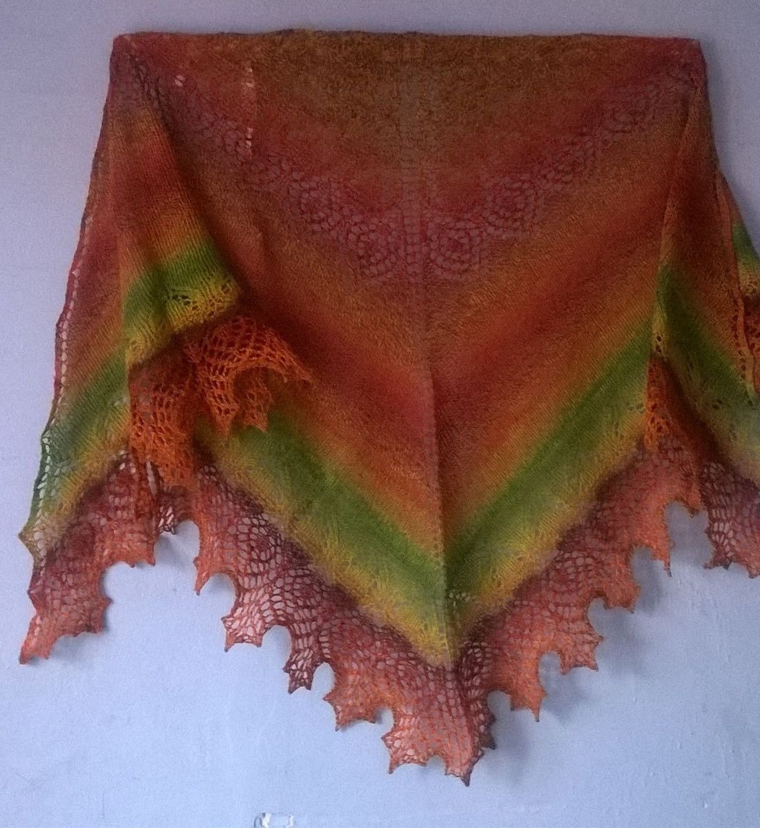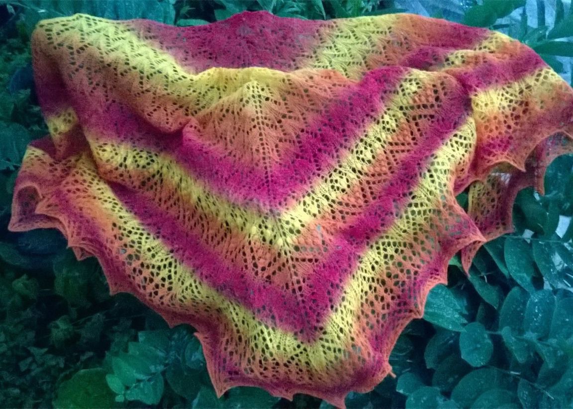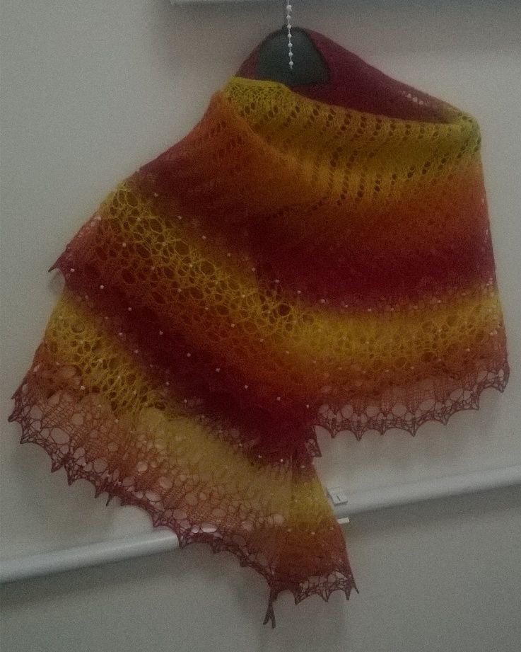 На следующих фотографиях: Шаль "Лопи-Лапушка", автор Татьяна Гобрусева, или Шаль Жар-птица / Firebird Shawl дизайнера Lilia Komosa, "Лебедушка" дизайнер Юлия Захлебина, которые имеют традиционную для шалей треугольную форму. А также шаль серповидной формы Ворона или Падающий собор дизайнера Marisa Hernandez.