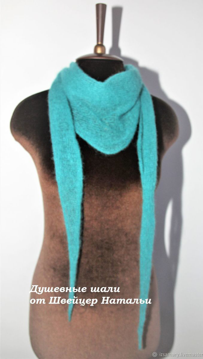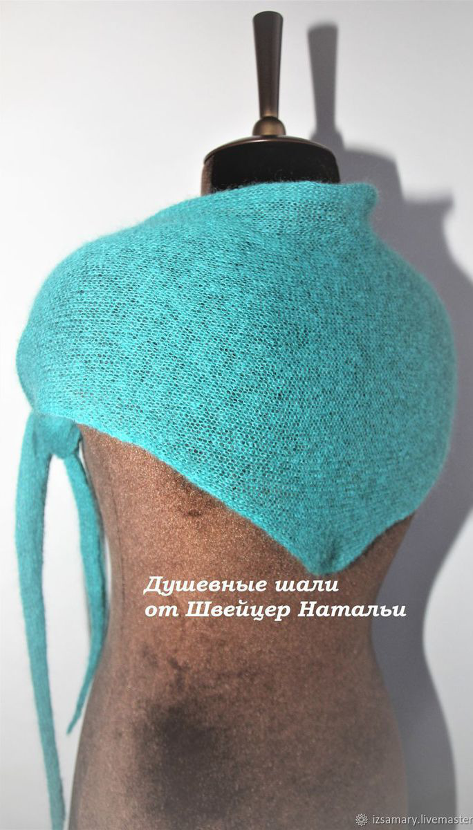 Небольшой шейный платочек, шарф-бактус (по спинке 35 см, по верхней кромке 208 см). Воздушная, изящная красавица цвета Морская волна будет прекрасным вариантом весной-осенью. тёплая за счет альпаки. Отлично драпируется, можно закрутить, как снуд.