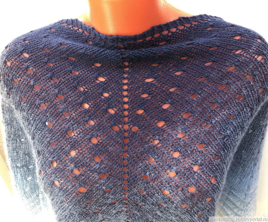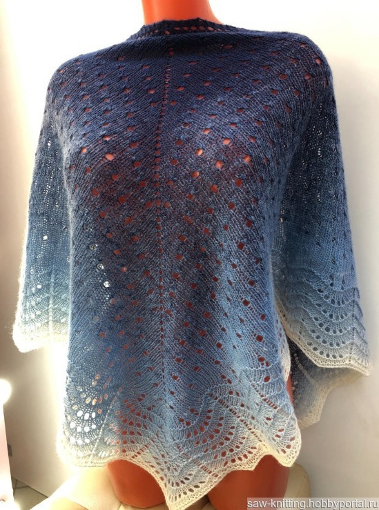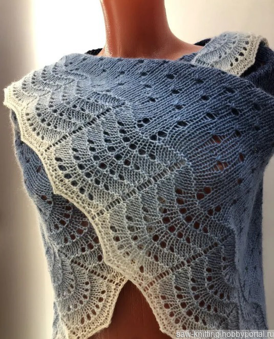 Платок треугольной формы (бактус) ручной работы из Коллекции "Синий туман" - благородный переход оттенков из черничного в лазурно-синий и белый.